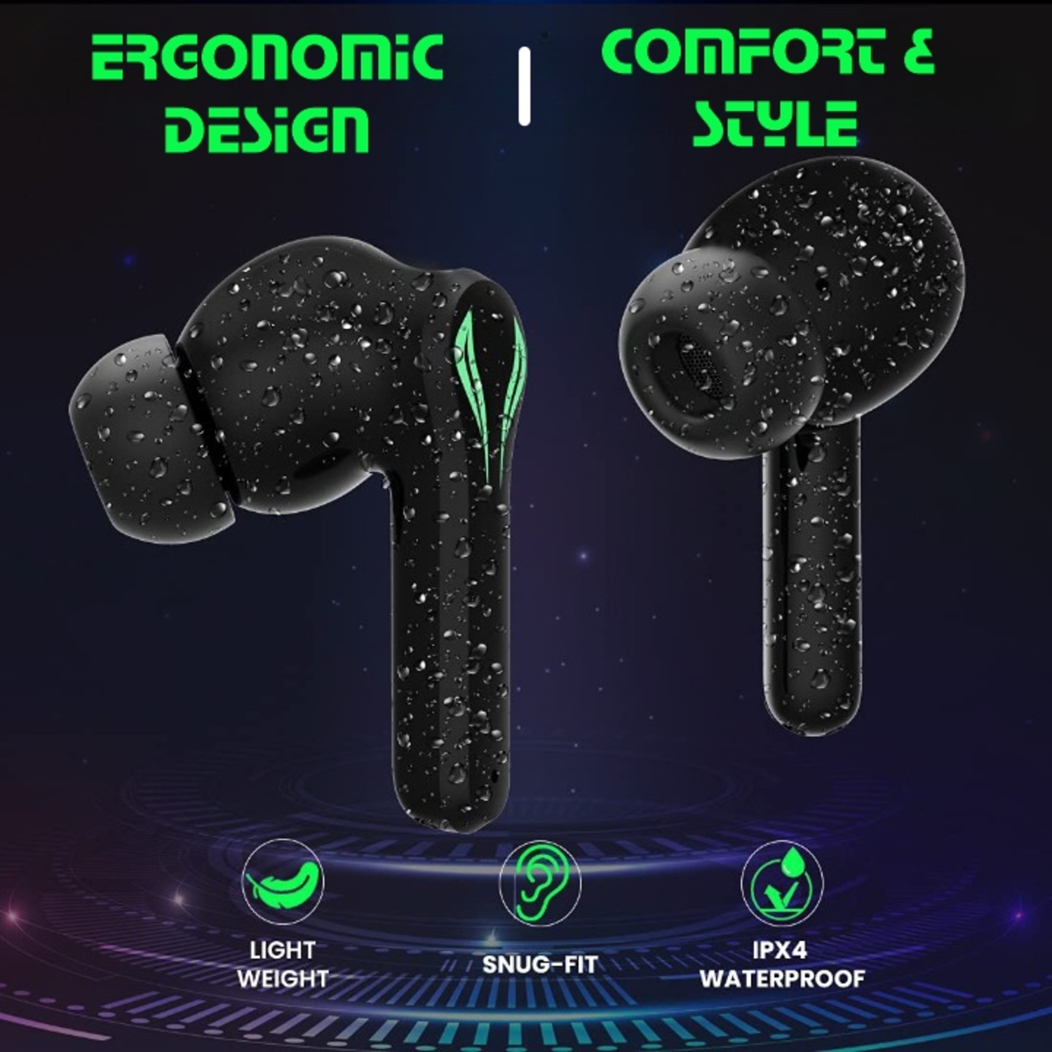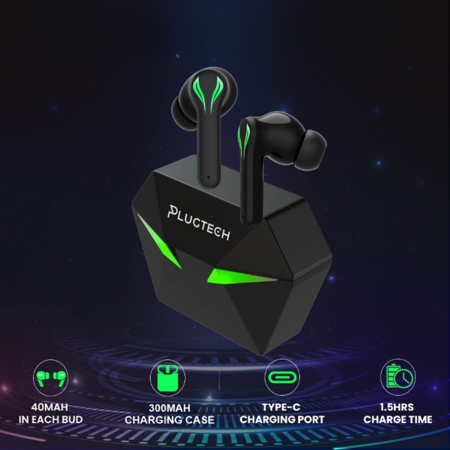 Plugtech AlienPods 100 is a true Gaming TWS Earbuds True Wireless Headphone with 30Hrs Total Playtime with Case, Low Latency, Deep Bass, BT5.0, Touch Control, Dual Mic, Passive Noise Cancellation & IPX4 Waterproof (Black)Gaming & Music ModeTouch TSA on the right earbud for 3 seconds to change modes Game & Music. Note: Music Mode will be On by DefaultGaming Wireless Headphones with Ultra-Low Latency; Hi-Fidelity Stereo Sound quality with Punchy Bass; Massive 40Hrs Total Playtime with the Charging Case; Touch Control Ergonomic EarbudsBT5.0 with 10 meters Wireless Connectivity; 1-Step Pairing; Quick Connect; Dual HD Mic for Clear Calls; Wide Compatibility with BT Smart Devices13mm Dynamic Speakers; Lightweight In-Ear Earbuds; Snug-fit Minimises External Noises; IPX4 Water/Sweatproof; Instant Access to Devices Voice Assistant; 40mAh Battery in Each Bud; Just 1.5Hrs ChargeCompact 300mAh Charging Case with Glaring LED Lights; Type-C Charging; Just 1.5Hrs Charge Time; 120Hrs Standby Time; Mini Charging Cable IncludedWarranty6 Months Carry IN manufacturer warranty from the date of purchase.Caution: Using incompatible USB cables or high voltage chargers can damage the product & void the product warranty. We strongly recommend using DC5V-1A chargers & the USB cable included in the package.4 Quick Taps on the Touch Sensitive Area of Either Earbud to Change the Modes Gaming or Music. Note: Music Mode will be On by Default.Gaming Wireless Headphones with Ultra-Low Latency; Hi-Fidelity Stereo Sound quality with Punchy Bass; Massive 40Hrs Total Playtime with the Charging CaseTouch Control Ergonomic EarbudsBT5.0 with 10 meters Wireless Connectivity1-Step PairingQuick ConnectDual HD Mic for Clear CallsWide Compatibility with BT Smart Devices13mm Dynamic Speakers; Lightweight In-Ear EarbudsSnug-fit Minimizes External NoisesIPX4 Water/SweatproofInstant Access to Devices Voice Assistant; 40mAh Battery in Each BudJust 1.5Hrs ChargeCompact 300mAh Charging Case with Glaring LED LightsType-C Charging; Just 1.5Hrs Charge Time120Hrs Standby TimeProudly Made in India