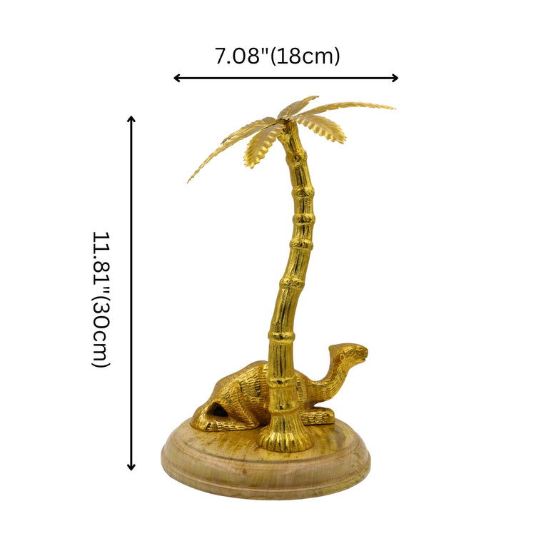 This beautiful golden camel and palm tree figurine is a striking addition to any home. Made from durable aluminium with a sturdy wooden base, its intricate details and lifelike design capture the serene beauty of the desert landscape.Aluminium
