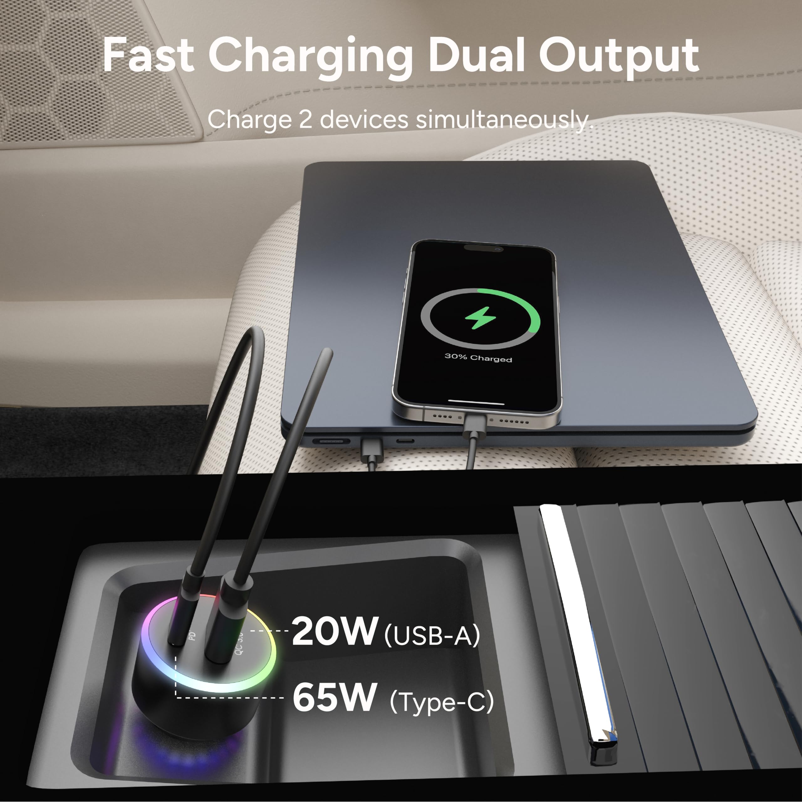 Portronics Car Power 65, Car charger, 100W Type-C Cable, Dual Ports, 65W Type-C PD, 18W USB