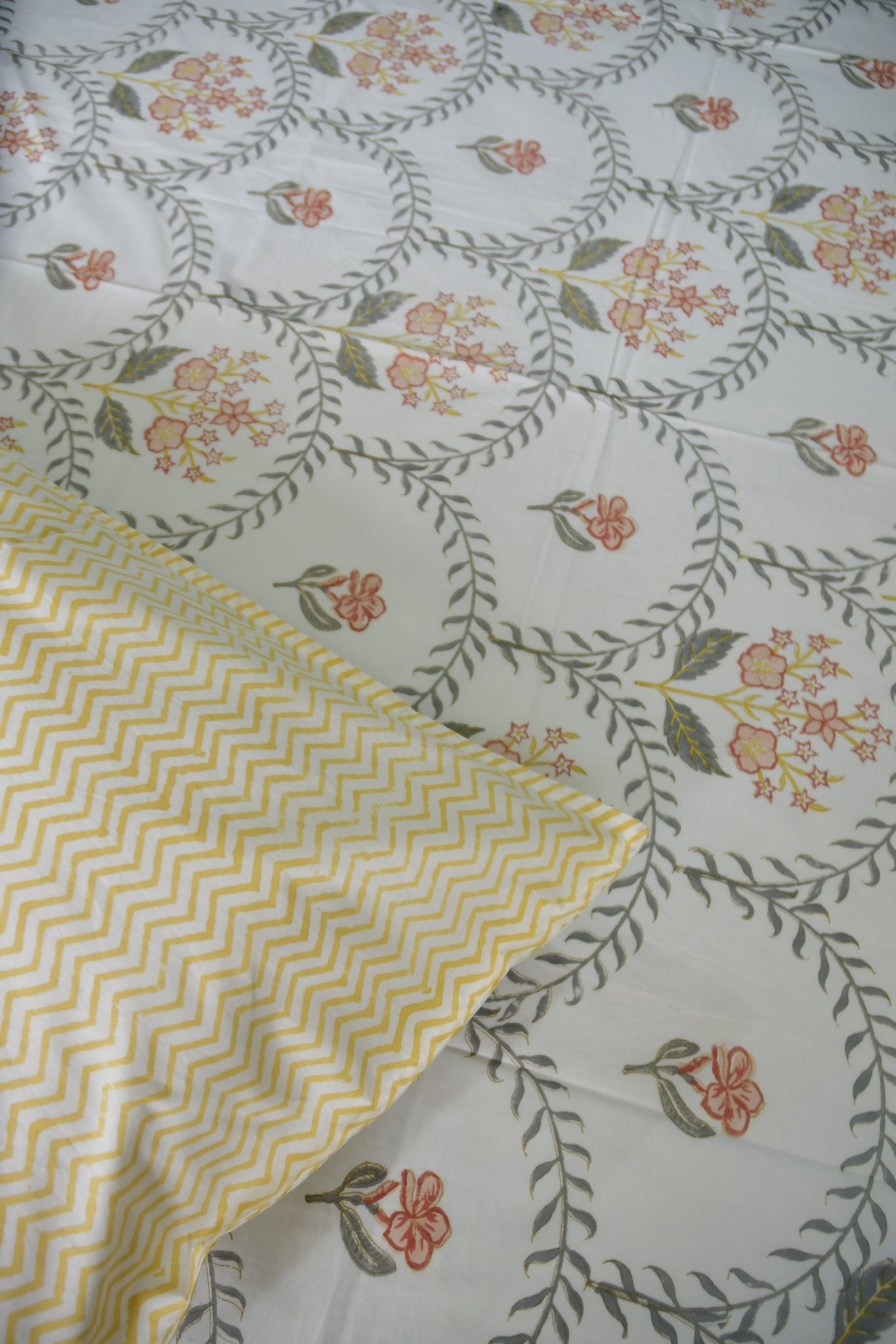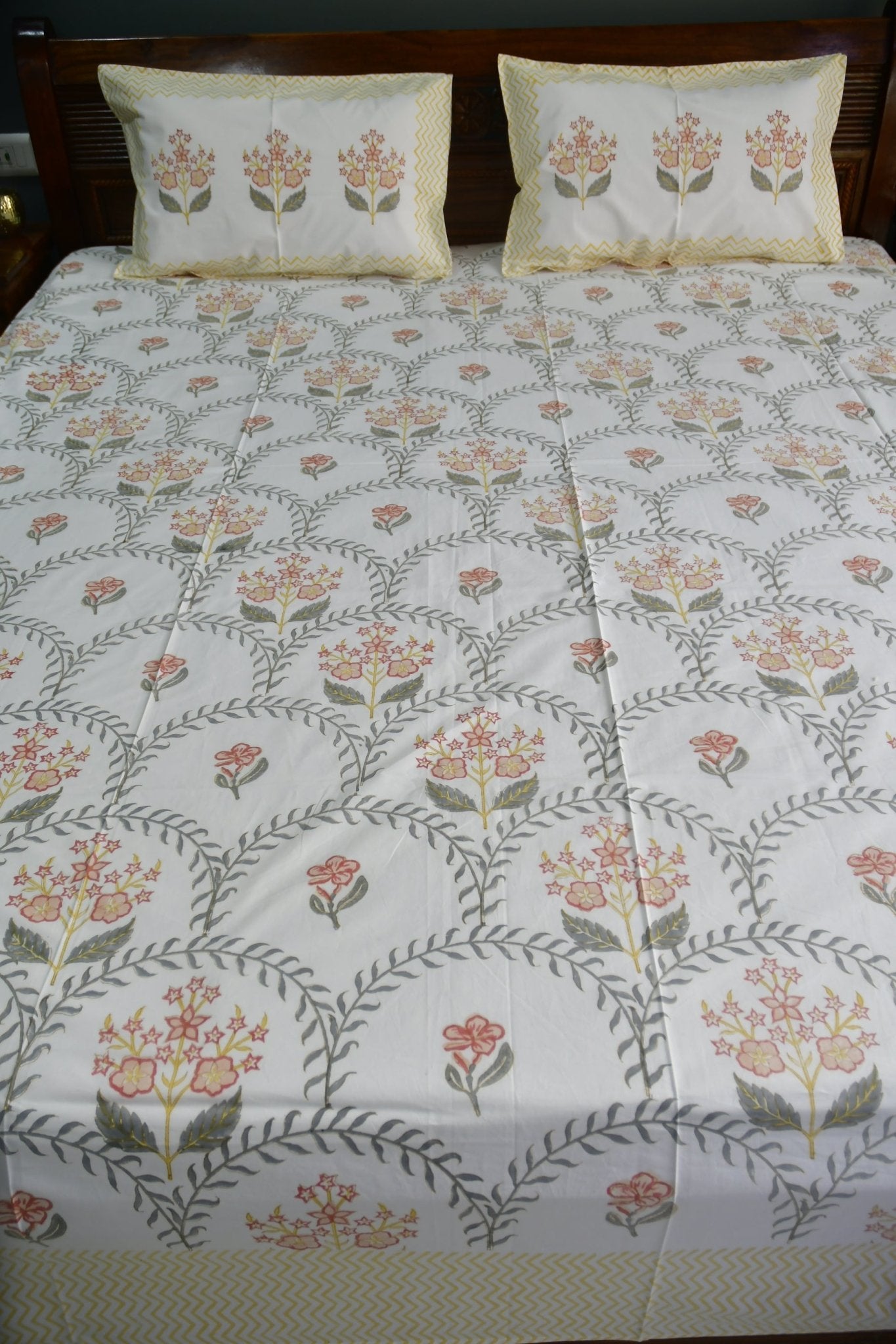 This tapered Basant Jaal Bedsheet is made from premium cotton that provides unparalleled comfort. It is handblock-printed with a fresh flower pattern, making it perfect for any bedroom decor. Its bright colors and elegant design promote restful sleep and ensure lasting freshness.Experience luxury with our Basant Jaal Bedsheet, meticulously crafted from high-quality cotton and adorned with Rajasthan's exquisite handblock prints. Elevate your bedroom decor and redefine comfort and style.