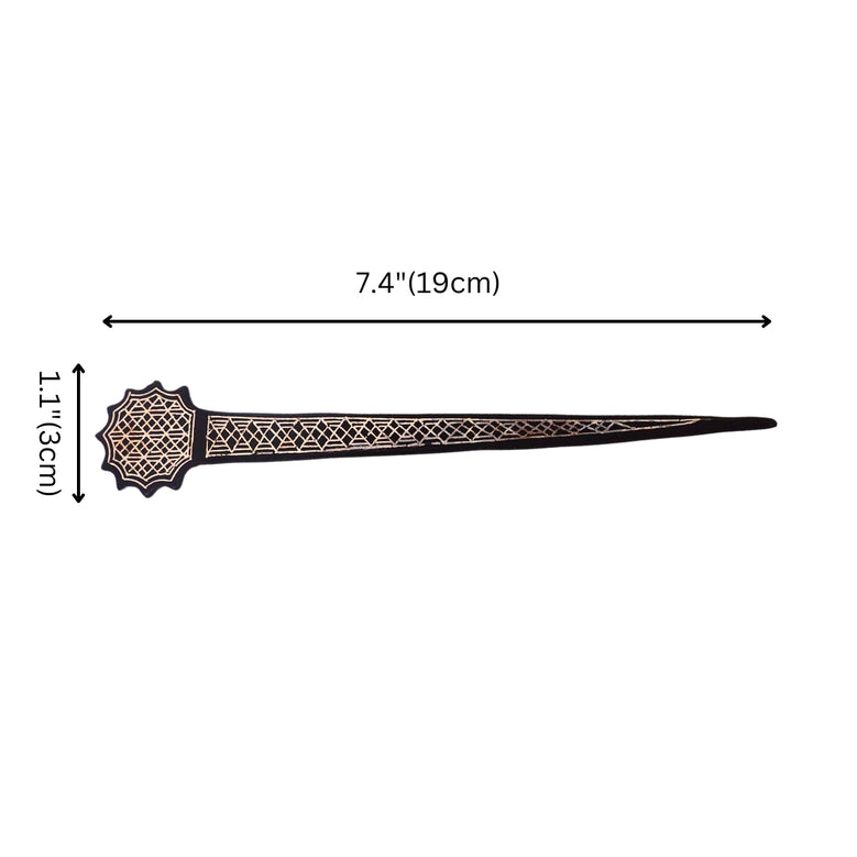 This exquisite Bidri art paper cutter and bookmark showcase traditional Indian craftsmanship. With a sleek black base and intricate silver inlay designs, its delicate patterns and shimmering finish create a captivating contrast, making it a stunning addition to any collection and a perfect blend of beauty and functionality.Gunmetal (an alloy of zinc and copper)