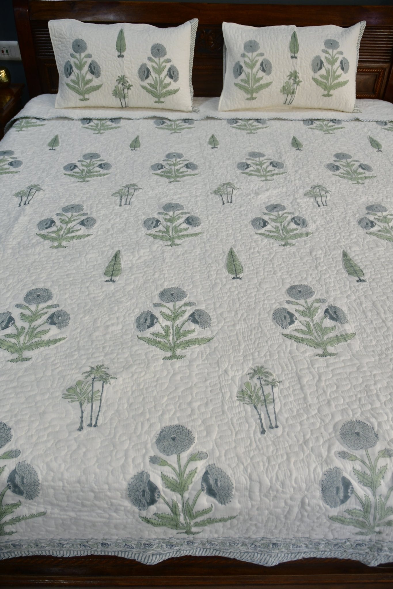 Product Description: This lively bedcover has beautiful handblock printed blue grey poppy fmotifs to give a breezy and classy decor to your bedroom. . The fabric is quilted and reversible for added convenience and durability, allowing for a lasting look and feel.Product Specifications: This set consists of one quilted bed cover and 2 quilted reversible pillow covers. Size: bed cover- 90x108 inches Pillow covers-19x28 inches Material: 100% premium cotton HandBlock Printed. The quilted design keeps the bedspread soft and lightweight, so you can enjoy a comfortable sleep. It's the perfect combination of style and practicality.Clean this product, either with dry cleaning or with a gentle machine wash using a mild detergent. When drying, keep away from direct sunlight.