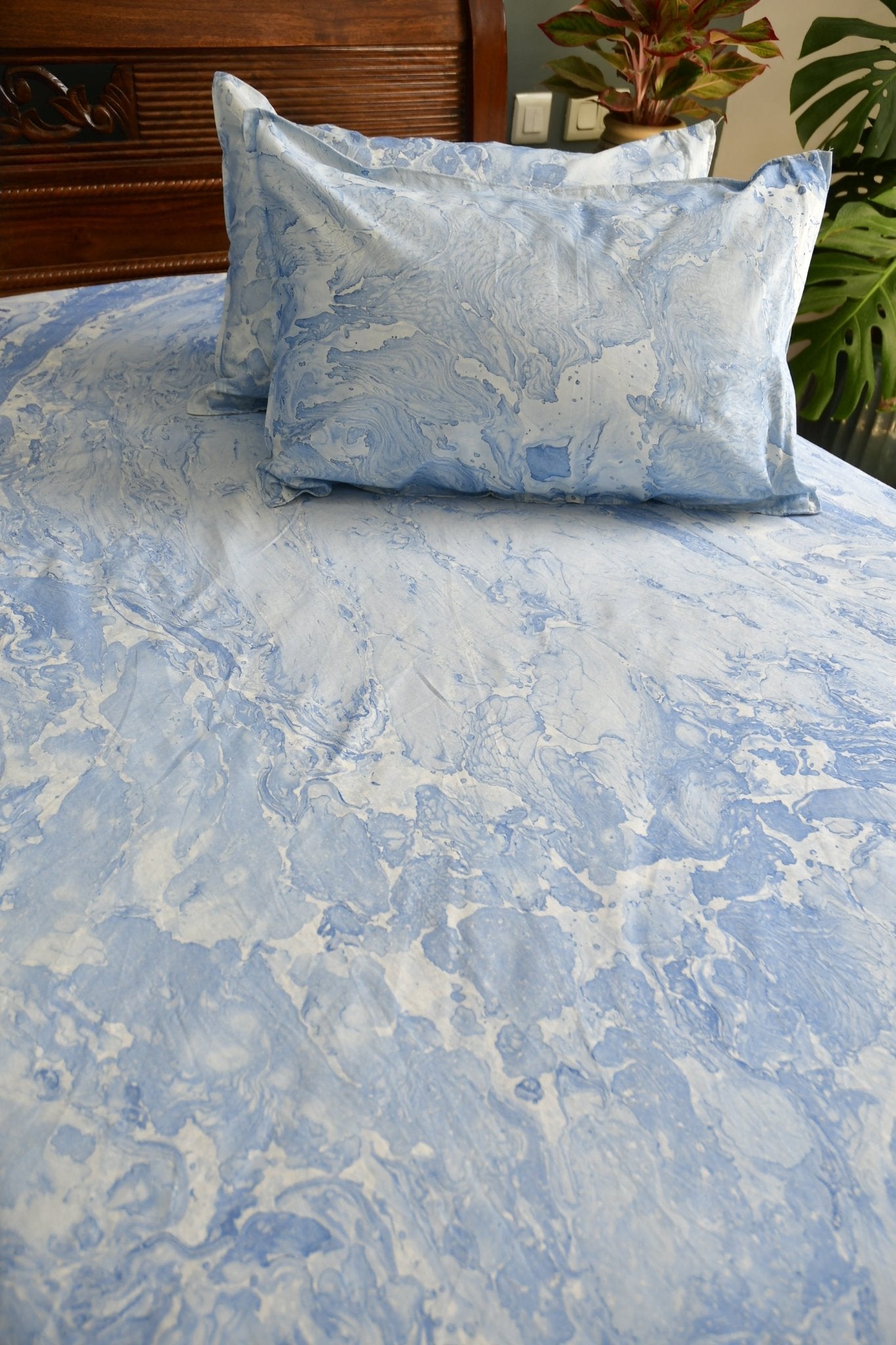 Elevate your bedroom decor with our Blue Marble Double Bedsheet, a blend of style and comfort. Handcrafted in Jaipur, Rajasthan, this bedsheet features a stunning blue marble pattern that brings a touch of sophistication to your space. Made from premium cotton, it offers softness and durability for a restful night's sleep. Transform your bed into a luxurious retreat with this exquisite bedding essential.size 100x108 inchesWith two Pillow Covers