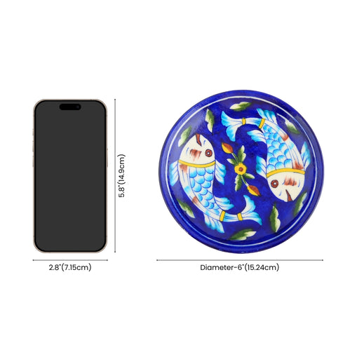Dive into a world where two charming fish swim gracefully amidst blooming flowers on a deep blue backdrop. This GI-tagged plate from Jaipur reflects artistic excellence and heritage. Whether adorning your wall or serving delicacies, it brings a splash of marine magic, eternal beauty, and a touch of tradition to your home.Material - Blue Pottery - A blend of quartz powder, ground glass, saji, katira gond, and multani mitti.