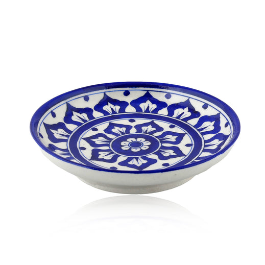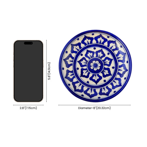 Experience floral perfection in this mesmerising Blue Pottery plate. Deep royal blue petals radiate from a central flower, forming a captivating, hypnotic pattern. Small blue dots highlight the intricate design, making it an exquisite blend of tradition and artistry, ideal for display on wall or serving.Material - Blue Pottery - A blend of quartz powder, ground glass, saji, katira gond, and multani mitti.