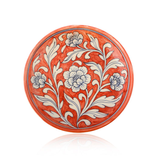 Discover the magic of Jaipur's artistry with this striking plate. A majestic white bloom unfurls its petals against a warm red backdrop, whilst delicate scrolling leaves create an elegant frame. This GI-tagged treasure brings centuries of craftsmanship to your table.Material - Blue Pottery - A blend of quartz powder, ground glass, saji, katira gond, and multani mitti.