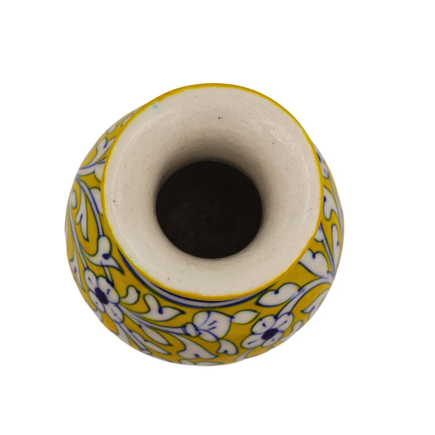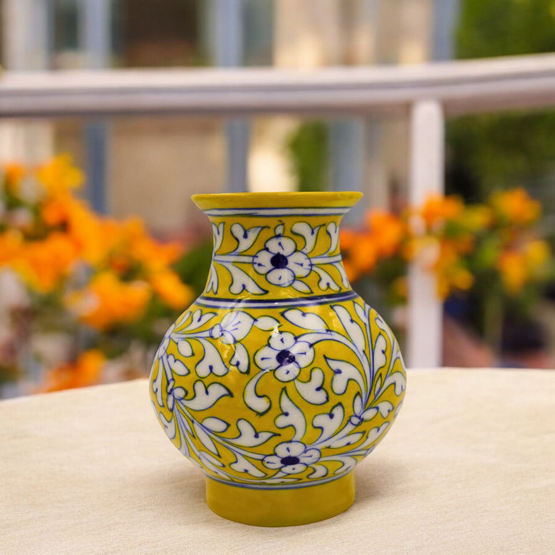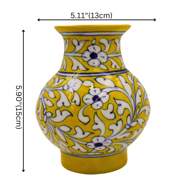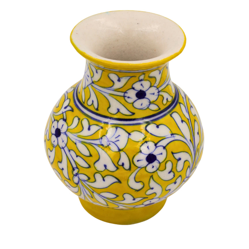 Enhance your home with our stunning hand-painted blue pottery vase from Jaipur, India. This masterpiece showcases intricate white and blue floral designs on a yellow base, blending classic and contemporary styles. Crafted with traditional techniques, the vase boasts a durable construction and elegant glazed finish. Ideal for displaying flowers or as a standalone decor piece, it brings royal charm and artistic flair to any space.Blue Pottery - A blend of quartz powder, ground glass, saji, katira gond, and multani mitti.