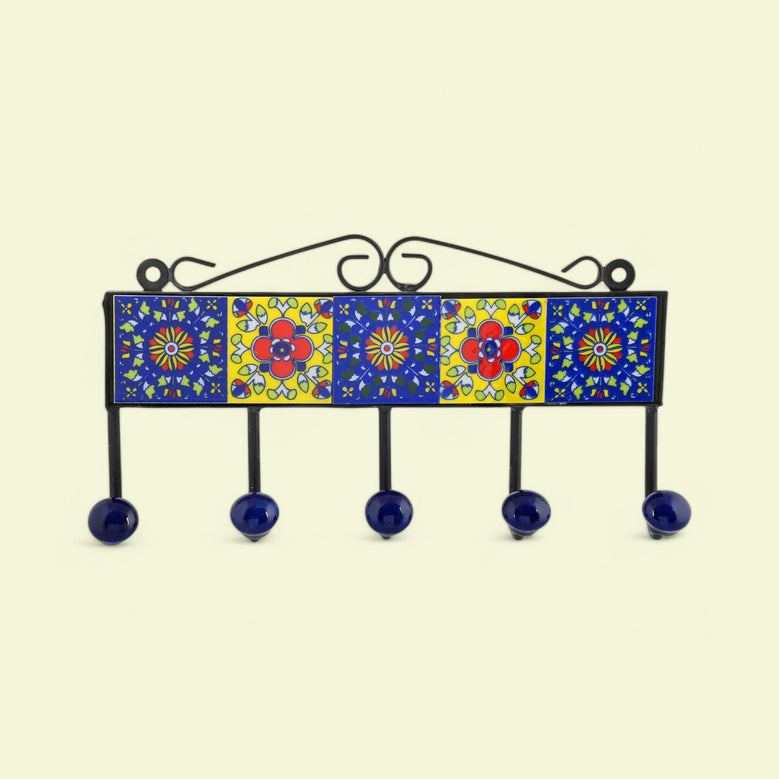 Blue Pottery Inspired Decorative Key HolderBlue & Yellow5 Hooks