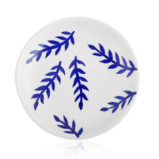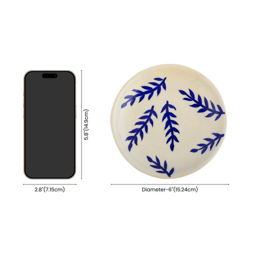 Graceful blue leaves sweep across this creamy white plate like nature's own brushstrokes. Each leaf tells a story of Jaipur's artistic heritage. This GI-tagged masterpiece brings a touch of traditional elegance to your walls or dining table. A perfect blend of art and functionality!Material - Blue Pottery - A blend of quartz powder, ground glass, saji, katira gond, and multani mitti.