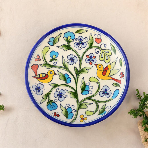 Welcome spring to your table with this cheerful creation. Two vibrant yellow birds perch amidst lush green branches, surrounded by delicate azure blooms. The intricate hand-painted details bring a touch of natures beauty to your space, making it a charming addition to your collection of Jaipurs Blue Pottery.Material - Blue Pottery - A blend of quartz powder, ground glass, saji, katira gond, and multani mitti.