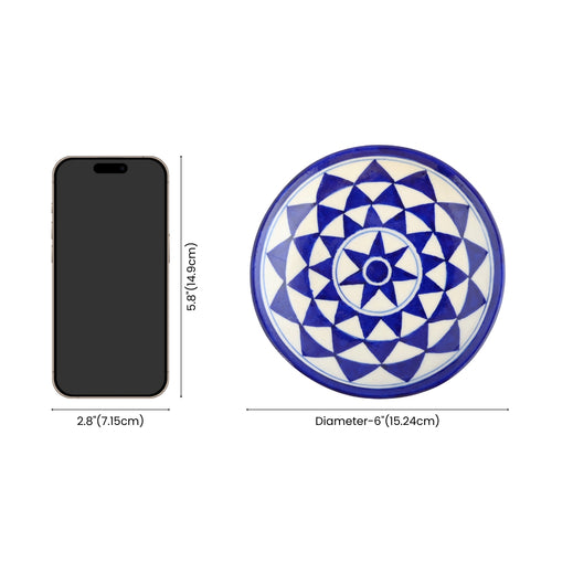 Journey through a mesmerising maze of triangles forming a spectacular star pattern. This handcrafted beauty showcases Jaipur's finest Blue Pottery craftsmanship. The intricate geometric design creates an optical illusion that captivates every viewer. Transform your space with this traditional treasure!Material - Blue Pottery - A blend of quartz powder, ground glass, saji, katira gond, and multani mitti.