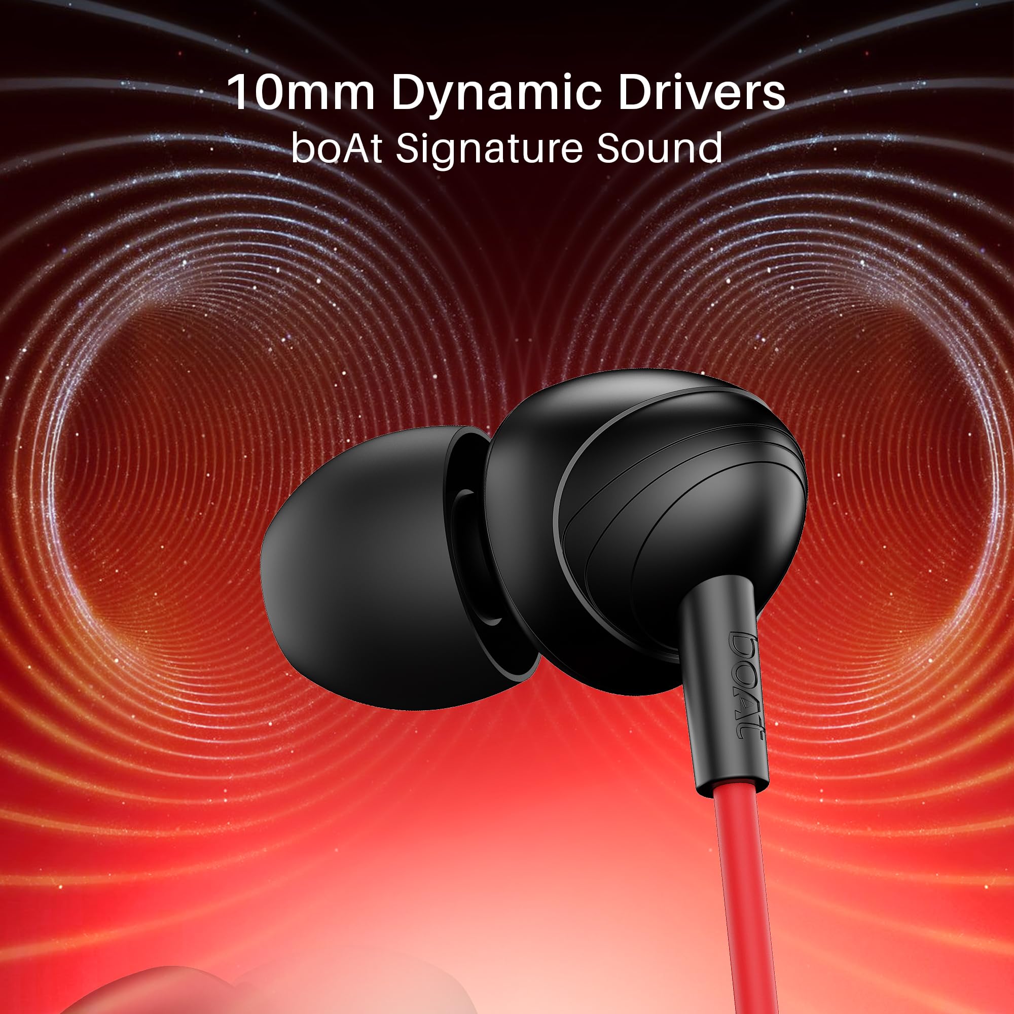 boAt BassHeads 104 It is time to get hooked into the clear, sassy sound of BassHeads 104. A carefully crafted half in-ear design with casual elegance in abundance, choose your colour that sets your vibe and begin the journey! Connect easily to all types of devices via its 3.5mm jack. Enjoy a comfortable listening and hassle-free usage experience with the perfect length cable. The 10mm drivers have been equipped to deliver that super extra bass you love. Equipped with an in-line mic and voice assistant feature, access easy entry to any call or query and pause/play music at your convenience. Immersive Audio For all the audio lovers out there! The Bassheads 104 carries pure music reproduction techniques via 10mm drivers that make you step with style and live within the beat, Get Hooked. Lightweight Secure Fit Design The Bassheads 104 looks cool, fiery, and deadly depending on which color you choose! With a secure fit and a design that brings out the best in you, it is time to define fashion your way. An Absolute Experience Enjoy the bliss of Immersive Audio pumped out by 10mm Dynamic Drivers and carry your sound in a carefree way with the lightweight BassHeads 104. Experience the Audio Bliss! Specifications Connect & Play Headphone Type In-Ear Super Extra Bass Yes Driver Size 10 mm Impedance 16Ω Sensitivity (dB) 107db Frequency Response 20Hz-20KHz Noise Isolation Passive Microphone Yes Country Of Origin China Rated Power 3mW Compatibility All 3.5mm Jack Device Hands-free communication In-line mic That turns around all sound as you handle your business with simple finesse as you are able to take calls and and let nothing get in your way. FAQs Q. Can I pause/play & change tracks with the earphones? Yes, one can pause/play, change tracks, pick and hang up calls. BassHeads 104 comes with a host of intuitive features that allows one to seamlessly control music. Please refer to the instruction manual to learn about the different ways one can take advantage of its features. Q. Does it have an in-line microphone? Yes, BassHeads 104 comes with an in-line microphone. The microphone also features in-built noise isolation technology. Q. Is it good for meetings and calls? Yes, with its in-line microphone and in in-built noise isolation technology, BassHeads 104 is perfect for meetings and working from home. Q. Does it come with noise cancellation? Yes, BassHeads 104 comes with passive noise cancellation. Q. What is the length of the cable? The cable is 1200mm long. Q. Is there a warranty for the product? How do I claim warranty? Yes, all of our earphones come with a 1 year warranty. To register your device, visit https://support.boat-lifestyle.com/.