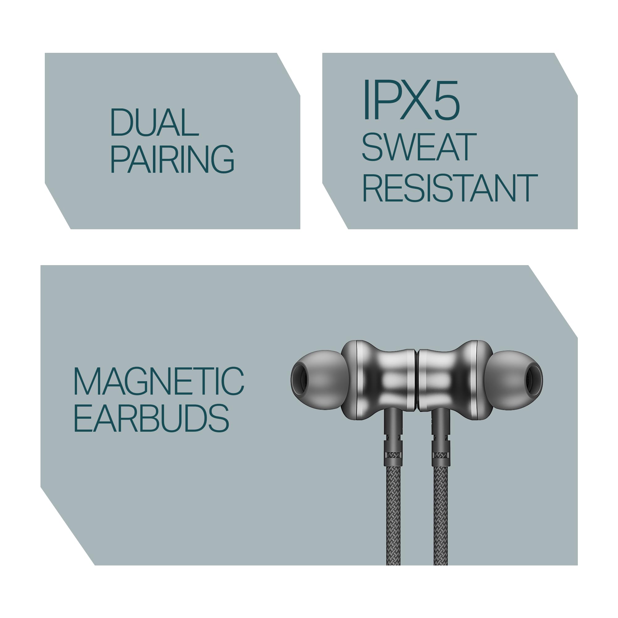 Rockerz 235 Pro - Wireless Earphones Let Rockerz 235 Pro fuel your passion like a pro. Take your hustle up a notch as its up to 20 Hours playback will keep you pumped up throughout. The BEAST™ Mode and its low latency will make you experience the best of both worlds. #UnravelYourFlow as you get maximum call clarity with ENx™ Technology equipped mics. Work hard & play harder with Rockerz 235 Pro empowering both your worlds. boAt Rockerz 235 Pro 10 Minutes Charge = 10 Hours of Playback Enjoy 10 Hours playback with 10 Minutes of ASAP™ Charge. Within a few minutes of ASAP™ charge, you can get yourself ready to shuffle through your favourite music playlist and binge-watch your favourite Netflix series. Battery That Lasts Up To 20 Hours With a monstrous playback of up to 20 Hours, keep dancing to the tunes of your mood and power your party all day and night. ENx™ Technology Greatly enhance call quality and block out wind noise and background distractions with ENx™ Technology. This enables crystal clear sound, for you to be heard crystal clear, even in the most challenging conditions. Vibration Call Alert This well-designed headset provides vibrational alerts for incoming calls and hence offers you effortless hands-free calling. BEAST™ Mode (Low Latency) Bionic. Engine. And. Sonic. Technology. It significantly reduces latency to keep the audio and video in sync to ensure that you live every moment you visualize. 10mm Drivers Super Extra Bass With 10mm dynamic drivers and boAt Signature Sound, you get to experience rich sound and superior music quality every time you press play. The bass is tuned for a thumping listening experience that transports you to another world. IPX5 Water & Sweat Resistance with Secure Fit Stop at nothing and complete your daily runs even in pouring rains. Stay focused on the sport as you plug into your sound with the perfect for the outdoors and daily workouts, Rockerz 235 Pro. Dual Pairing with Bluetooth v5.2 Live a wireless life with BT v5.2. Enjoy flawless, uninterrupted and smooth delivery of music and stay connected to your phone as well as laptop simultaneously with the dual pairing feature. Specifications Connect & Play Headphone Type In-ear Driver Size 10mm*2 Bluetooth Version v5.2 Bluetooth Range 10m Battery Capacity 150mAh Playing Time Up to 20 Hours (at 60% volume) Charging Time About 1 Hour Charging Interface USB Type C Water Resistance IPX5 Country Of Origin China Magnetic Earbuds The behind-the-neck design is shaped for comfortable, all-day listening. Live a tangle-free life with magnetic earbuds. Multi-Function Integrated Controls Multi-Function Integrated controls lend an intuitive listening experience with volume increase/decrease and play/stop buttons.