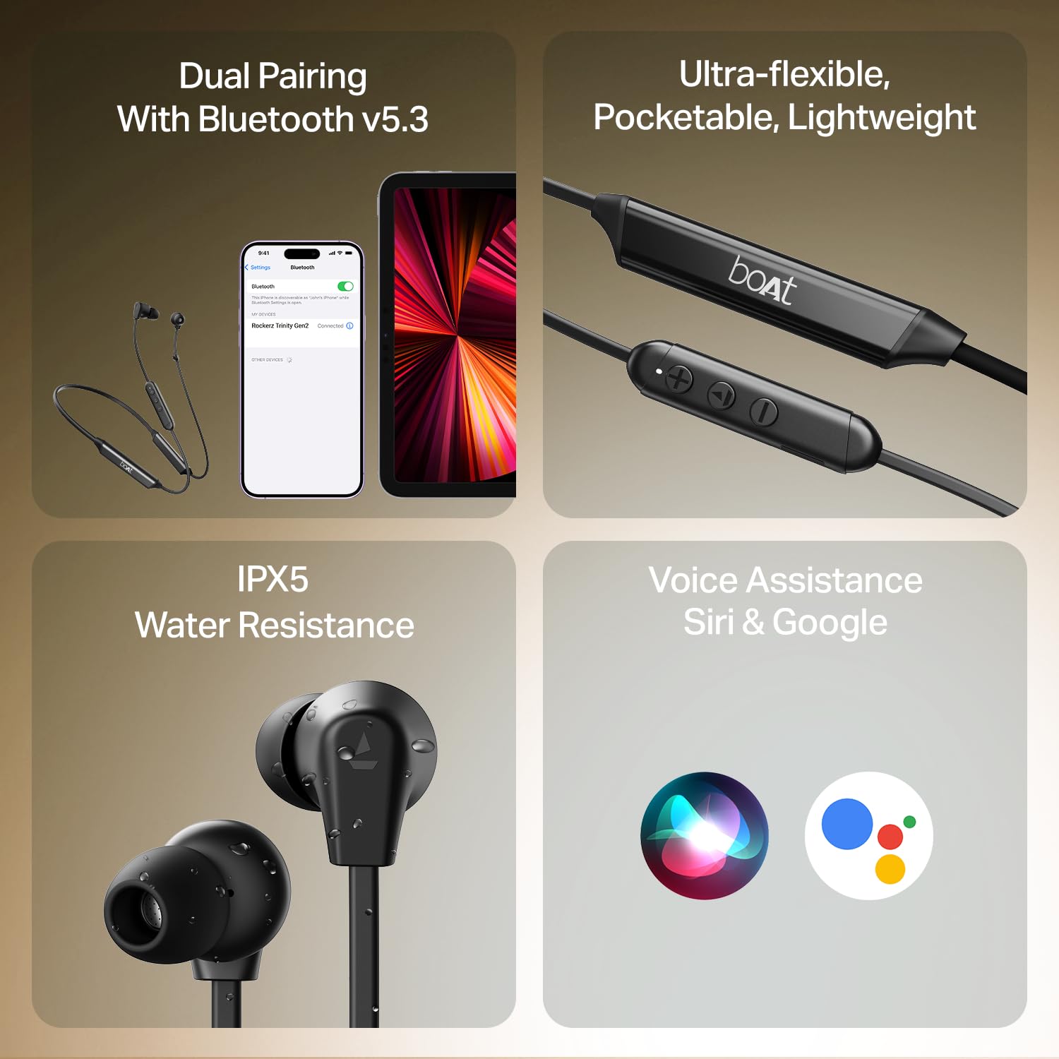 boAt Rockerz Trinity - Wireless Neckband Earphones with Crystal Bionic Sound powered by HiFi®️ DSP Introducing Rockerz Trinity – a game-changing wireless neckband that delivers an exceptional audio experience like no other. Rockerz Trinity combines cutting-edge technology with exceptional sound quality. It boasts Crystal Bionic Sound powered by HiFi® DSP, which delivers an immersive listening experience that's unmatched. Rockerz Trinity is boAt’s first-ever super portable neckband which gives you a massive 150 Hours playback! It is your time to tune into superior audio with Rockerz Trinity. Unmatched Sound, Unimaginable Performance Equipped with Crystal Bionic Sound Powered by HiFi® DSP Rockerz Trinity optimizes sound using the Digital Signal Processing algorithm to enhance the audio output, delivering a rich & powerful sound with clarity & detail. Not just this, its robust 10 mm drivers make the boAt Signature Sound shine through every call and beat that you hear while delivering thumping bass and superior audio. boAt’s First-ever 150 Hours Playback Neckband Your weekdays will come to an end but Rockerz Trinity with its massive 150 Hours playback will still go on. Boost your wireless experience with industry-leading ASAP™ Charge Technology of Rockerz Trinity that fuels your device for an unparalleled playback of up to 24 Hours with just 10 Minutes of charge. Best in class AI ENx™ Technology Rockerz Trinity comes with AI ENx™ Technology that greatly enhances the call quality by blocking out all the wind noise and trivial background distractions. With better voice intelligibility, you can now make and receive calls smoothly without having to worry about the chaos around you. Convenience Is Spelled As Rockerz Trinity Forget the hassle of connecting from a different device every time you need to plug your Rockerz in. Dual Pairing allows you to stay connected from multiple devices and makes it easy for you to switch between your playlist, meetings, and phone calls. Say No To Lags Whether it is for your visual entertainment or you have to make your opponent bite the dust while gaming, Rockerz Trinity got you covered! Equipped with BEAST™ Mode giving you 65ms low latency, this neckband ensures you get the smoothest experience of it all without lags! Specifications Connect & Play Bluetooth Version v5.2 IPX Rating IPX5 Music Playtime Up to 150 Hours Beast Mode Yes Charging Time About 1 Hour Operating Range 10m Driver Size 10mm*2 Frequency 20Hz-20KHz Battery 220mAh X 2 Compatibility All Bluetooth Devices Charging Interface Type C Country Of Origin China FAQs Q. How can we pause and play tracks? Rockerz Trinity Wireless Bluetooth earphones come with a host of intuitive features including the Quick Switch Button that allows the user to switch between two devices by just double tapping. This gives you full seamless control over music and other media. Please refer to the instruction manual to learn about the different ways one can take advantage of its features. Q. Can we accept calls on boAt Rockerz Trinity Wireless earphones? Yes, a single press on the multi-function button allows the user to easily accept and reject calls. Q. Can I use any adapter to charge my device? Yes, you can use any adapter to charge your Rockerz Trinity. Q. How long does boAt Rockerz Trinity last on a single charge? Rockerz Trinity offers a battery backup of up to 150 hours on a single charge. Q. Does it support Fast Charging? Rockerz Trinity supports ASAP Fast charging. Q. Can I charge my earphones with a mobile charger? A. Yes, Rockerz Trinity supports Type-C charging. If your mobile charger comes with Type-C charging support then you can easily use the same to charge your device. Q. Is it good for office use and for calls, meetings, media consumption etc.? Yes, Rockerz Trinity is perfect for a variety of uses. It can be used for calls, meetings making it perfect for Zoom, Meet, Teams etc. Q. Are they compatible with iPhones and Android phones? Yes, Rockerz Trinity is fully compatible with iPhones and Android devices. Q. How can I connect with Google and Siri? Rockerz Trinity comes with a ‘single-press’ voice assistant to connect with your voice assistant. Please refer to the manual for further instructions. Q. Is there a warranty for the product? How do I claim warranty? Yes, all of our neckbands come with a 1 year warranty. To register your device, visit https://support.boat-lifestyle.com/. DOWNLOAD MANUAL