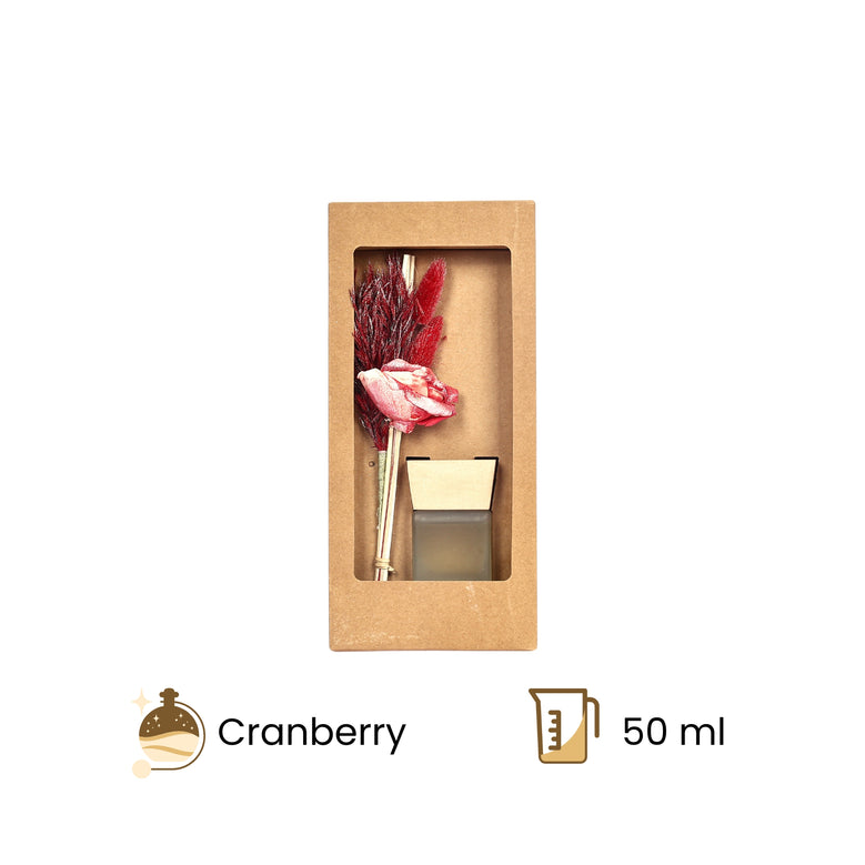 Surround yourself with scents inspired by nature. Lift your spirits with our Cranberry Reed Diffuser and let the vibrant energy and fruity aroma of cranberry transform your space. The rich red tones of handmade Sholapith flower and naturally dried botanicals, enhanced with organic spray paint, add warmth and elegance to any room. Perfect for creating a lively and inviting ambience, this diffuser brings cheerful charm and natural beauty to your home.Naturally dried grass, and handmade Sholapith flower
