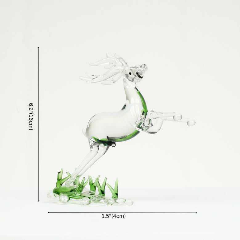 Handcrafted with precision, this glass running deer embodies the grace and freedom of nature. Its transparent form is enhanced by delicate green accents, while the dynamic glass grass base adds a lively touch. A striking piece of dcor, it brings natural elegance and timeless beauty to any room, captivating attention effortlessly.Glass