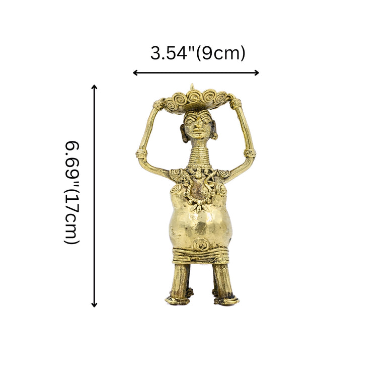 This candle holder showcases the rustic charm of Dhokra art, a tribal craft from Chhattisgarh, India. Crafted using the ancient lost-wax technique, it portrays a woman carrying a basket. The intricate details, from her features to her attire, reflect the local culture, highlighting the timeless Indian artistry.Brass