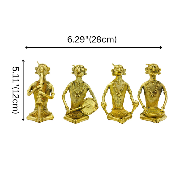 This captivating piece of Dhokra Art showcases a cultural and tribal art form of Chhattisgarh, India. It depicts a lively group of musicians, lost in their music. The attire, instruments, and facial expressions, all are meticulously detailed, which brings attention to local customs and cultural legacy of Indian craftsmanship.Brass