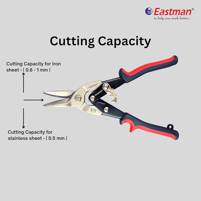 Introducing the Eastman Aviation Snip with CRV Blade, engineered for precision cutting in various materials. Crafted with overall heat salt treatment (HRC 42-46), it ensures durability and resilience against wear. The blade's edge undergoes specific salt treatment (HRC 56-60) for exceptional sharpness, ideal for intricate cutting tasks. Its jaws feature an anti-skid foundation, providing stability during use. This tool effortlessly handles iron sheets (0.6-1mm) and stainless steel sheets (0.5mm), making it versatile for professional and DIY projects. Designed for heavy-duty use, it includes a double-color sleeve for comfort and grip enhancement. Sized at 10/250mm, it offers optimal leverage and control. Ideal for craftsmen, mechanics, and enthusiasts alike seeking reliable cutting performance.