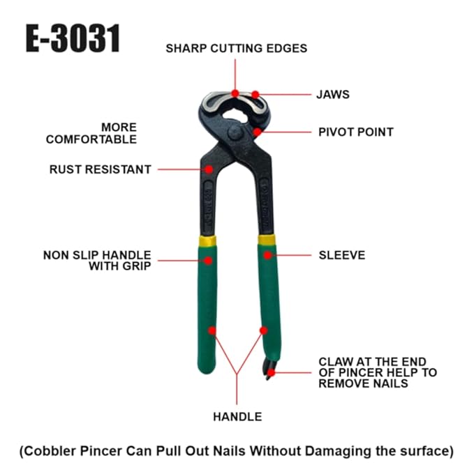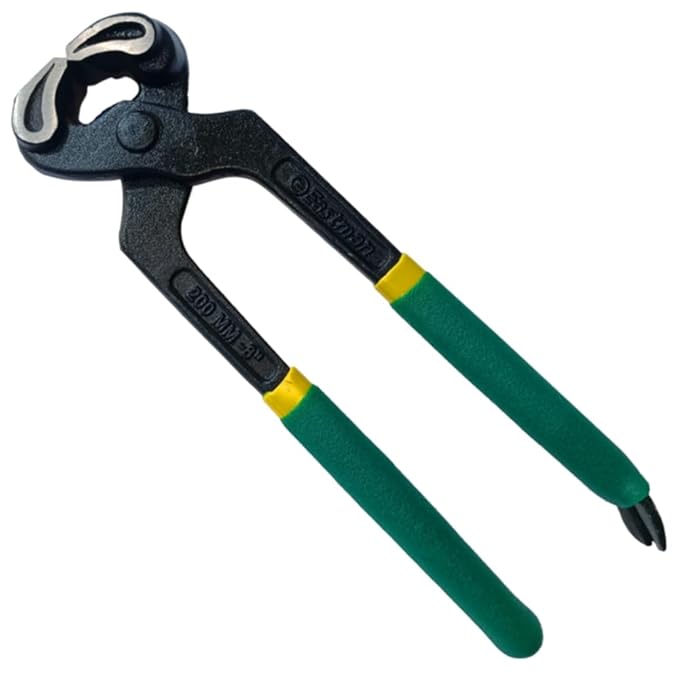 The Eastman Cobbler Pincer with Nail Puller (200 mm) is a high-quality, durable hand tool designed for precision and reliability. Made from selected drop-forged steel, it offers superior strength and longevity, ensuring it can withstand heavy-duty use. The 200mm size provides a comfortable length for precise control, making it ideal for detailed work. Equipped with a nail puller, this pincer effortlessly removes nails, tacks, and other fasteners from leather, wood, and other materials. The 200 mm length provides an ergonomic grip, allowing for excellent control and leverage when working with nails, staples, or other fasteners. The tool's yellow and green sleeve enhances both its visibility and comfort, offering a secure and non-slip grip. Its robust construction and user-friendly design make it a must-have for professionals and DIY enthusiasts alike. The tool features a unique combination of a pincer design with a nail puller, making it ideal for various tasks, such as shoe repairs, construction, and woodworking.