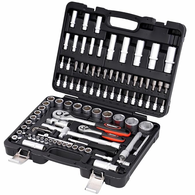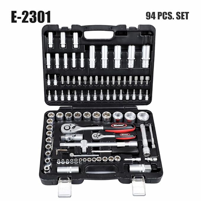 Eastman Tool Kit Ratchet (12.7 mm)1/2 Inch & (6.3) 1/4 Inch Sq. Drive 94 Pcs Socket & Bit Set, Tool Kit, Chrome Vanadium Steel, Knurled Sockets, Satin Finish,Heavy Duty Gripped Handle Ratchet (E-2301)