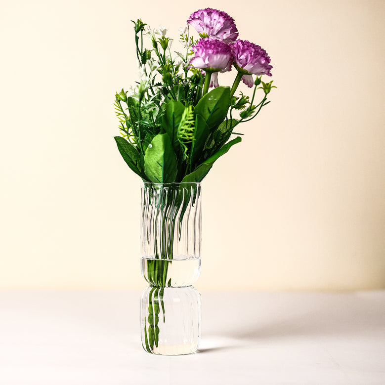 Display your favourite flowers in this modern glass vase, featuring a textured ribbed pattern and a graceful hourglass shape. Its transparent design adds a touch of sophistication to any space, making it a versatile dcor piece. Perfect for living rooms, dining areas, or as a chic accent on any table.Glass