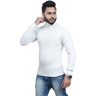 Fashlook Solid High Neck Wool Blend Casual White Full Sleeve T-Shirt For Mens