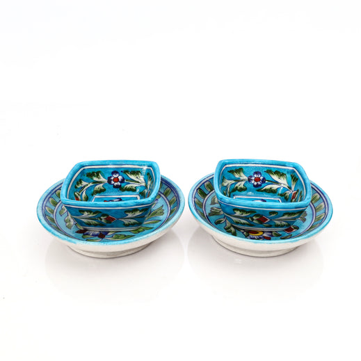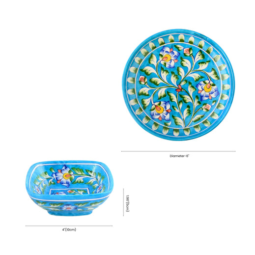 Infuse your dining moments with the colorful charm of this Jaipur Blue Pottery Round Plate & Square Bowl Set, adorned with hand-painted floral vines in vibrant hues. The fusion of a classic round plate with a distinctive square bowl adds both elegance and functionality to your collection. Crafted by artisans using age-old techniques, this set offers a blend of heritage artistry and modern-day versatility.Material - Blue Pottery - A blend of quartz powder, ground glass, saji, katira gond, and multani mitti.