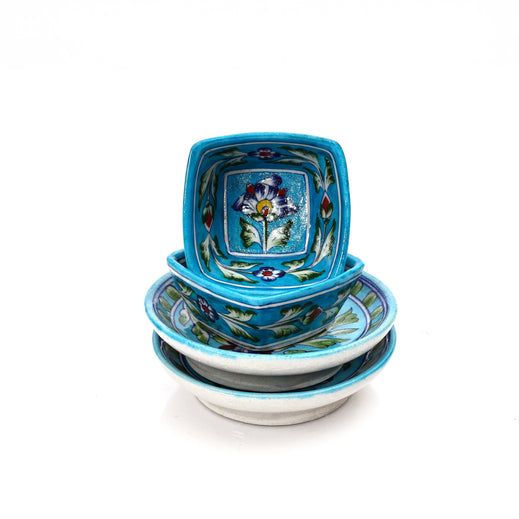 Floral Round Plate & Square Bowl Set  Handcrafted Jaipur Blue Pottery for Modern Dining