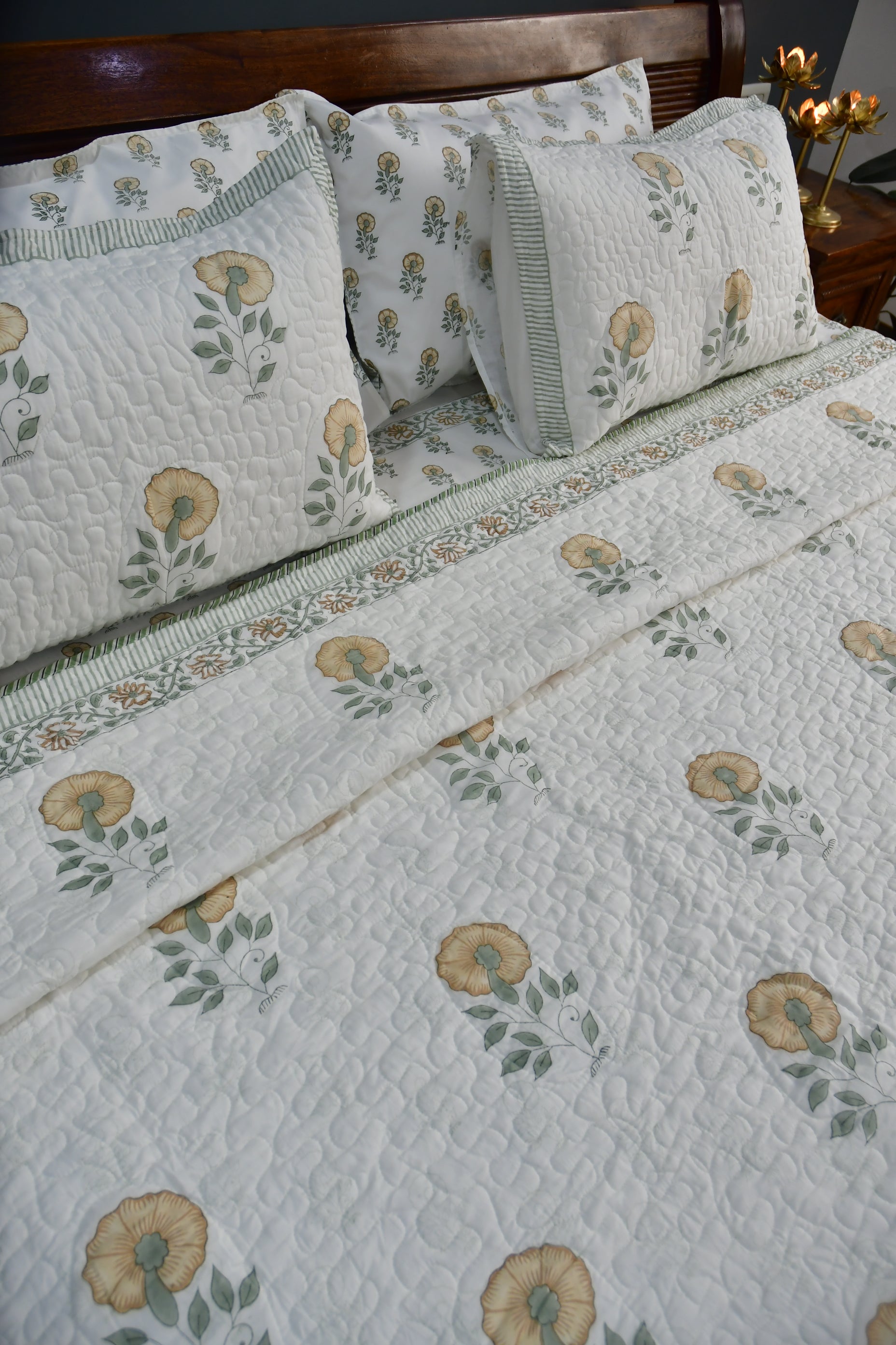 Product Description: This lively bedcover has beautiful handblock printed Yellow floral motifs to give a breezy and classy decor to your bedroom. As the name suggests it will give your space a fresh positive feel. The fabric is quilted and reversible for added convenience and durability, allowing for a lasting look and feel.Product Specifications: This set consists of one quilted bed cover and 2 quilted reversible pillow covers. Size: bed cover- 90x108 inches Pillow covers-19x28 inches Material: 100% premium cotton HandBlock Printed. The quilted design keeps the bedspread soft and lightweight, so you can enjoy a comfortable sleep. It's the perfect combination of style and practicality.Clean this product, either with dry cleaning or with a gentle machine wash using a mild detergent. When drying, keep away from direct sunlight.