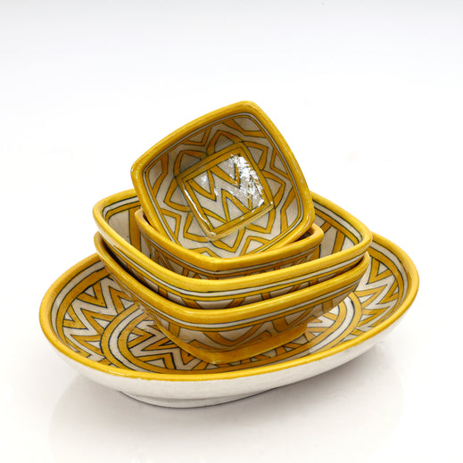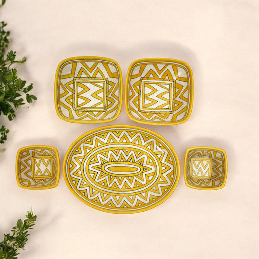 Geometric Yellow Oval Platter & Bowl Set  Handcrafted Jaipur Blue Pottery for Contemporary Dining