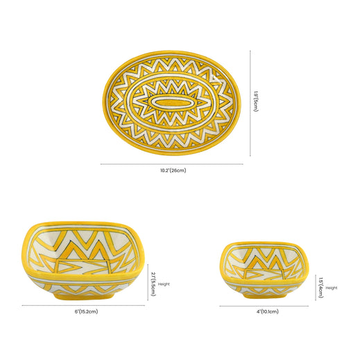 Add a bold artistic flair to your table with this striking Yellow Geometric Blue Pottery Set, featuring a handcrafted oval platter and two bowls. The eye-catching zigzag pattern, hand-painted in vibrant yellow and white, infuses a modern twist into the timeless tradition of Jaipur Blue Pottery. Perfect for festive gatherings or stylish everyday dining, this set balances cultural heritage with geometric elegance.Material - Blue Pottery - A blend of quartz powder, ground glass, saji, katira gond, and multani mitti.
