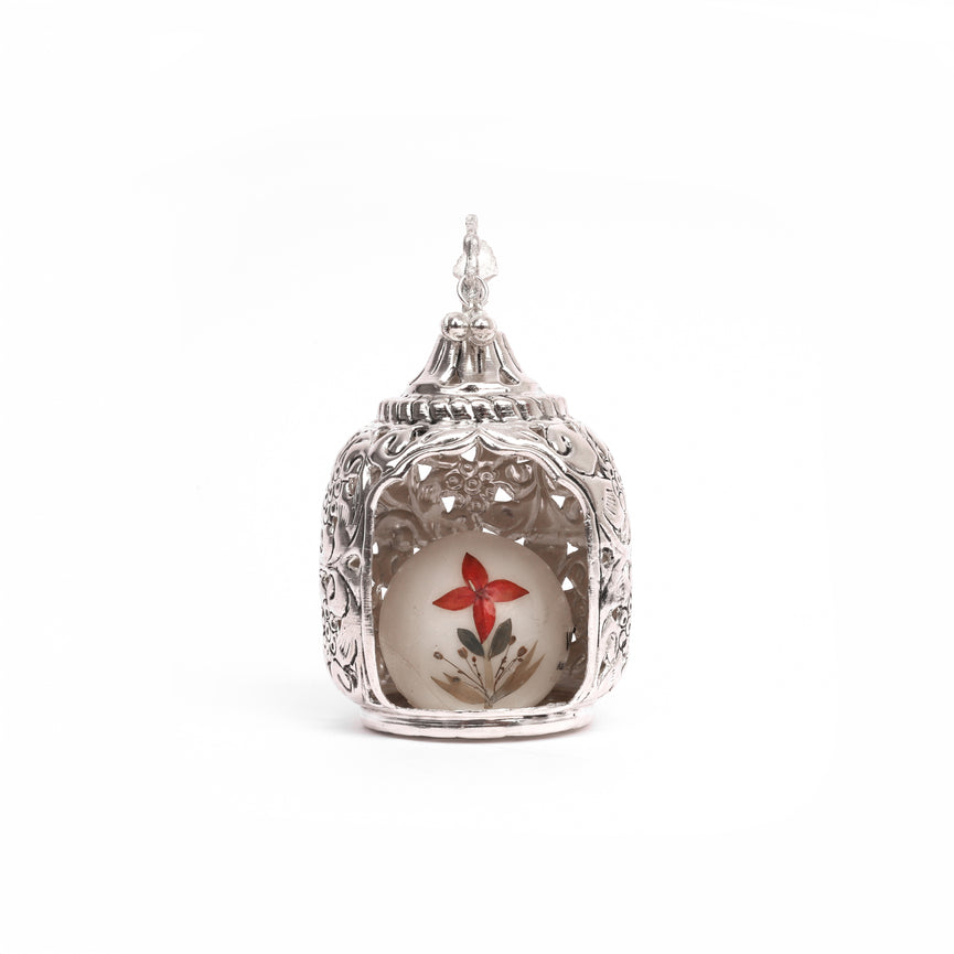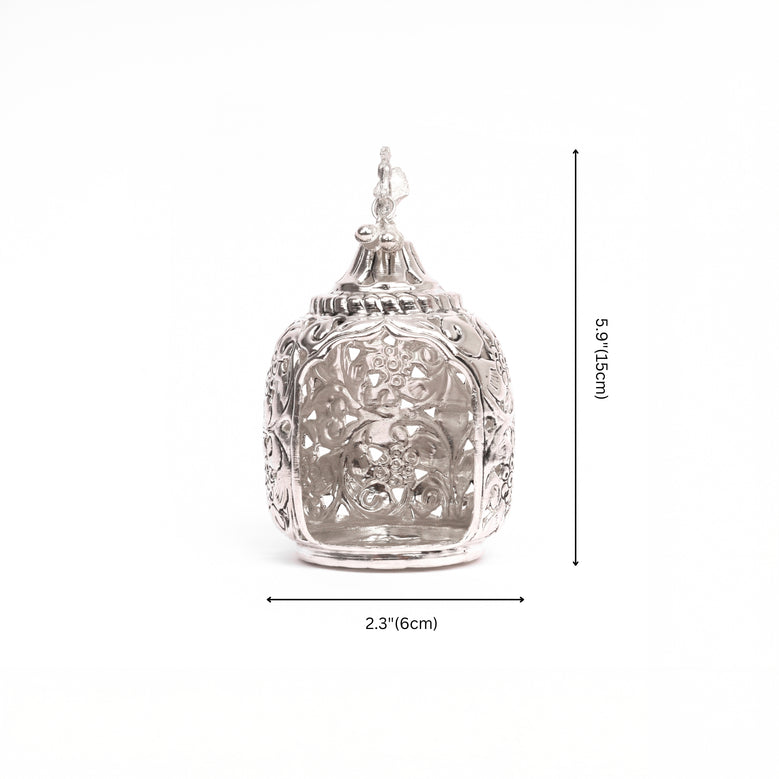 Light up your celebrations with this stunning German Silver T-light holder, featuring a beautiful peacock miniature on top. The intricate floral engravings and lattice design create a magical ambience, filling your space with warmth and elegance.Metal