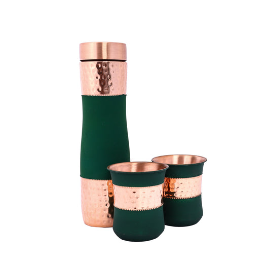 Make your sip healthy with this beautiful copper set! The bottle shines with hand-hammered patterns and is wrapped in green hues, making it look stylish and unique. Two matching glasses complete the set, making every drink special., Material - Copper