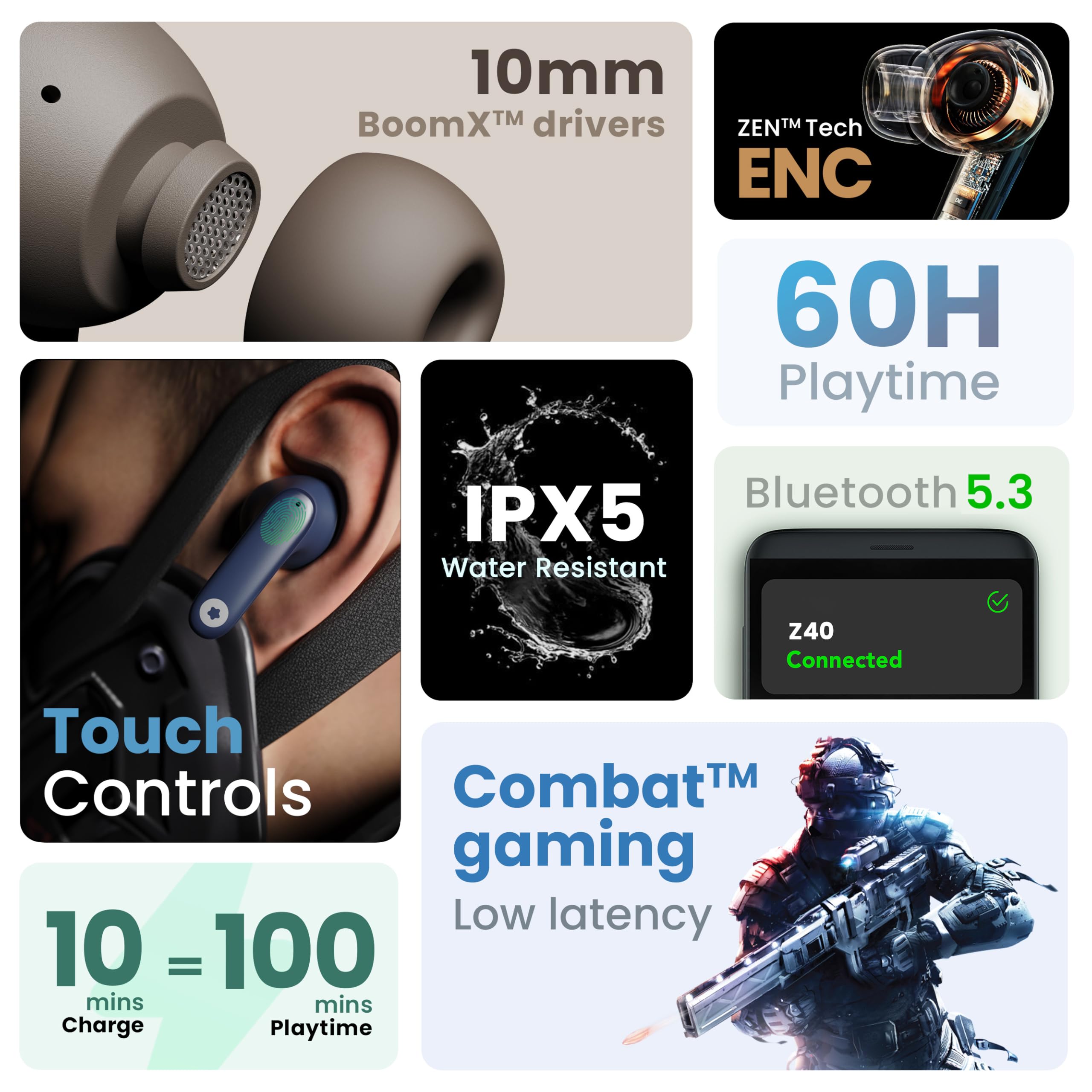 60-Hour Playtime: The GOBOULT (Formerly Boult) Z40 earbuds offer an impressive 60 hours of continuous playtime on a single charge, ensuring you can enjoy your music, podcasts, or calls for days without needing a recharge. Perfect for long journeys, workdays, or extended use. Zen ENC Mic for Clear Calls: Communicate with ease using the advanced Zen Environmental Noise Cancellation (ENC) mic. This technology reduces background noise, providing clear and crisp voice quality for calls and voice commands. Low Latency Gaming Mode: The Z40 earbuds feature a low latency mode, designed to minimize audio delay, enhancing your gaming experience with perfectly synchronized sound. Enjoy an immersive and competitive edge in your favorite games. Powerful 10mm Drivers: Experience deep, rich bass with the Z40s 10mm drivers. Whether you enjoy bass-heavy tracks or dynamic soundscapes, these earbuds deliver a powerful and immersive audio experience. Type-C Fast Charging: Enjoy quick and efficient power-ups with Type-C fast charging. A brief charge provides hours of playback, making these earbuds ideal for those constantly on the move. Ergonomic and Comfortable Fit: Designed for long-term wear, the Z40 earbuds feature an ergonomic fit that stays secure during various activities, ensuring comfort even during extended listening sessions. Touch Controls: Manage your music, calls, and voice assistants effortlessly with intuitive touch controls. Easily adjust volume, skip tracks, or take calls with simple taps for a seamless experience. Sweat and Water Resistant: Built for an active lifestyle, the Z40 earbuds are sweat and water-resistant, making them durable enough for workouts, runs, and outdoor adventures. Sweat and Water Resistant: Built for an active lifestyle, the Z40 earbuds are sweat and water-resistant, making them durable enough for workouts, runs, and outdoor adventures. Proudly Made in India: Crafted with pride in India, the GOBOULT (Formerly Boult) Z40 earbuds support local manufacturing while offering high-quality performance tailored to Indian users.
