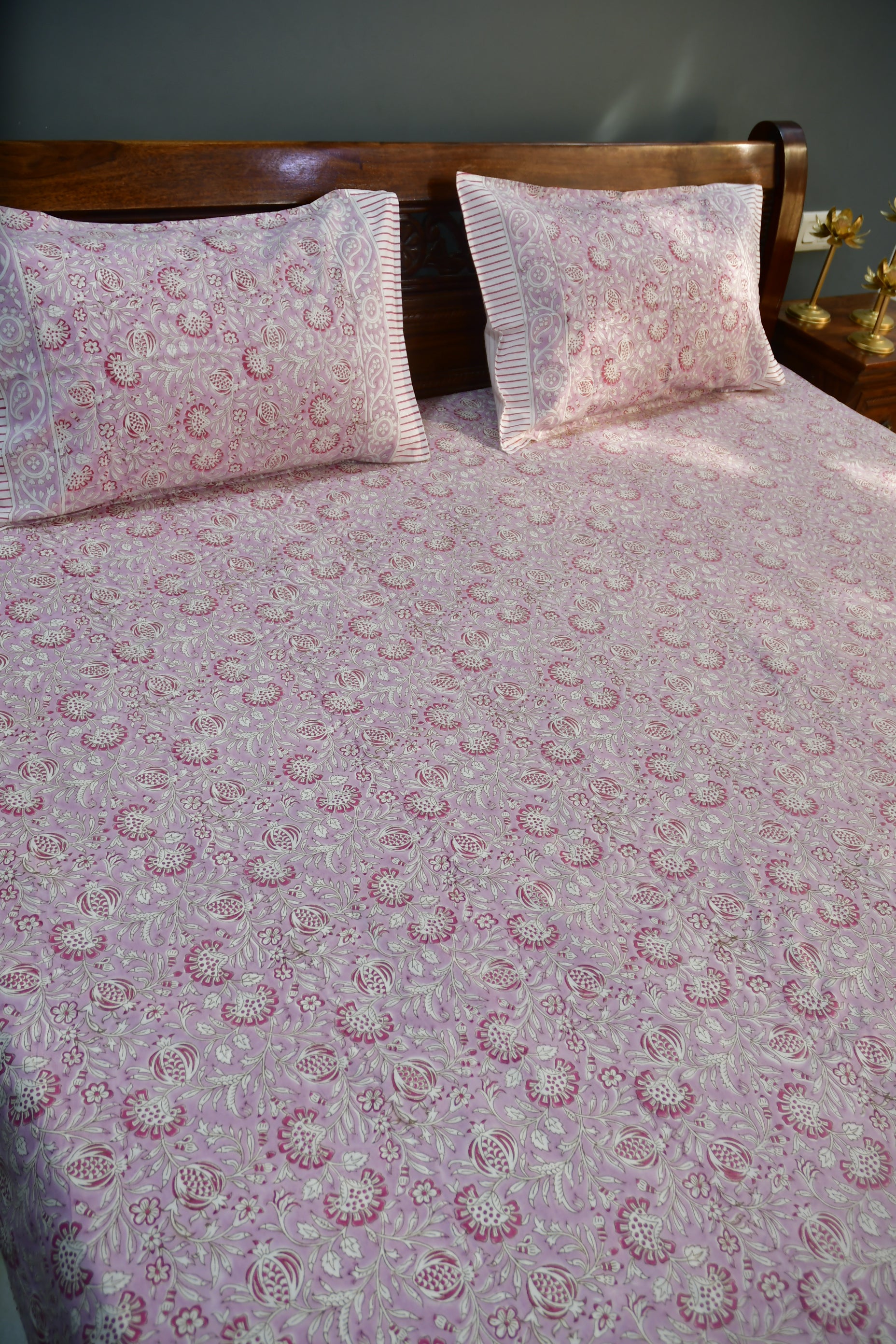 Bring the vibrant charm of spring into your bedroom with our captivating Gulaabi Floral Bedsheet. Crafted from the finest cotton and hand-block printed by skilled artisans in Jaipur, Rajasthan, this bedsheet boasts a stunning floral design in beautiful shades of Gulaabi (pink).Indulge in a World of Benefits:Hand-Block Printed Design:Each Gulaabi Floral Bedsheet is a unique work of art, showcasing the artistry of traditional Indian techniques.Soft & Breathable Cotton:Experience unparalleled comfort and breathability with our premium cotton fabric, ensuring a restful night's sleep.Vibrant Floral Pattern:Transform your bedroom into a blooming oasis with the cheerful and uplifting energy of the Gulaabi floral design.Perfect for All Seasons:The lightweight and breathable cotton makes this bedsheet ideal for year-round use.Thoughtful Gifting Option:Surprise your loved ones with a piece of Indian artistry and create a lasting impression.