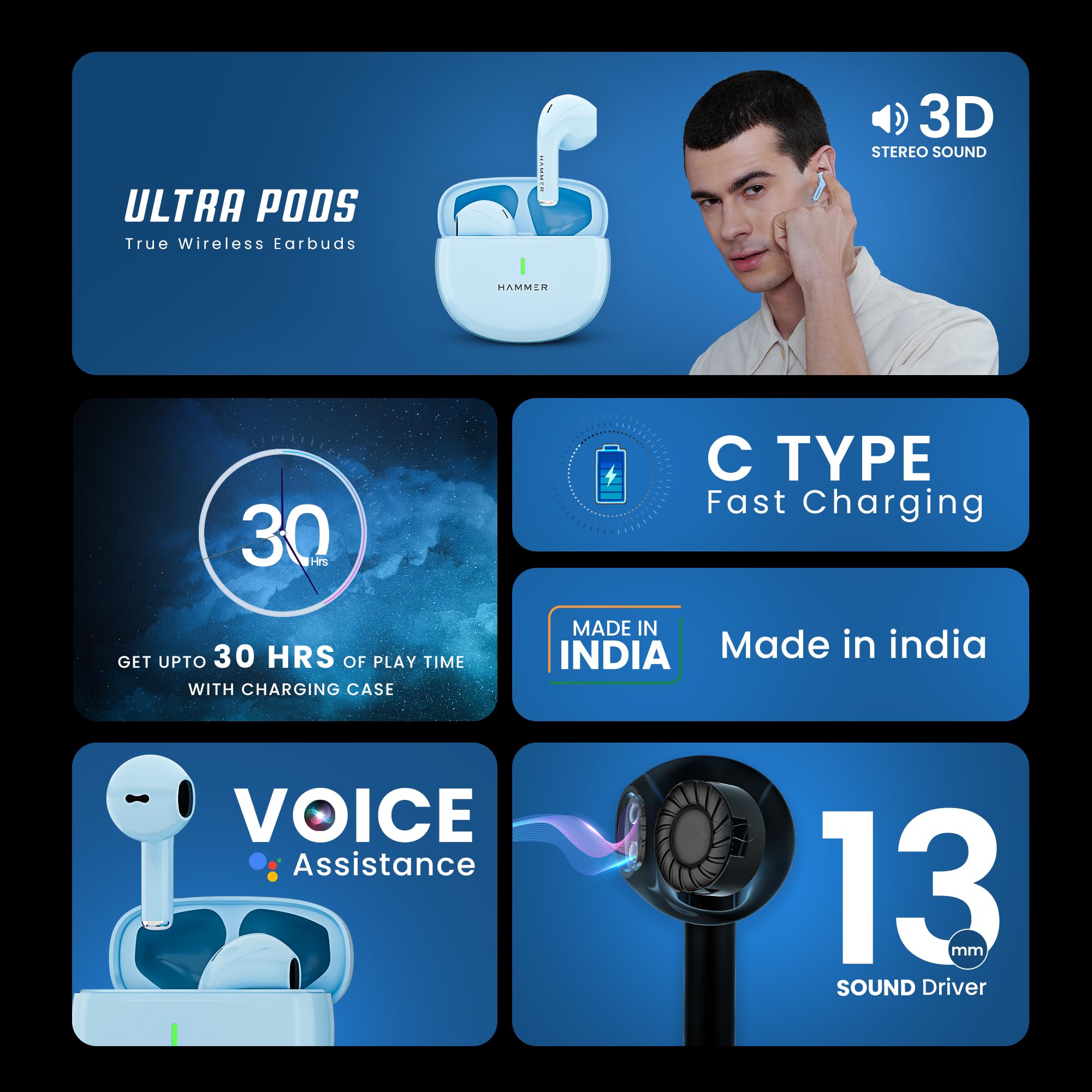 Portronics Twins S18 Pro in Ear TWS Earbuds with 30H Playtime, in Built HD Mic, Game/Music Mode, 13mm Dynamic Driver, Low Latency, Touch Control, Type C Fast Charging, Light Weight, Comfy Fit - Black