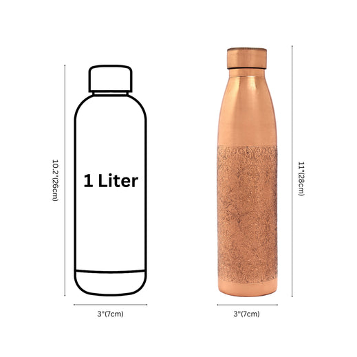 Stay hydrated in style with our Hand-Etched Pure Copper Water Bottle, an exquisite fusion of traditional craftsmanship and modern utility. Crafted from 100% pure copper, this bottle features intricate floral engravings along its body, adding an artistic charm that sets it apart. Its sleek, leak-proof design makes it ideal for daily useat home, at work, or on the go. Rooted in Ayurvedic tradition, drinking water stored in copper vessels is known to help balance the bodys doshas, improve digestion, and boost immunity., Material - Copper