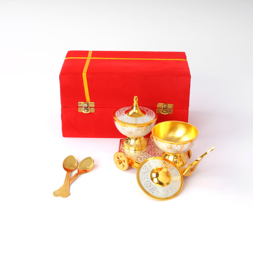 Imagine your celebrations glowing with elegance. This handcrafted and hand embossed brass bowl set with gold and silver finish will make your table shine. The miniature table trolley adds the perfect festive charm. Whether for gifting or your own celebrations, it's time to make every moment sparkle with luxury and style., Material - Brass