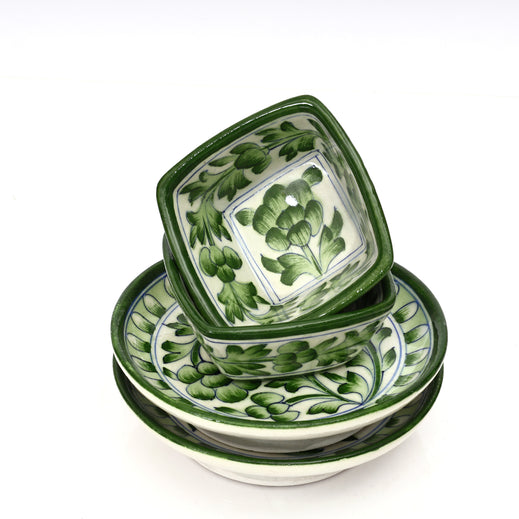 Experience the charm of Jaipurs timeless Blue Pottery with this hand-painted ceramic bowl and plate set. Designed with intricate floral motifs in a soothing green palette, this set embodies the perfect blend of art and functionality. Enhance your tableware with this stunning Blue Pottery set, a symbol of Rajasthans artistic legacy.Material - Blue Pottery - A blend of quartz powder, ground glass, saji, katira gond, and multani mitti.