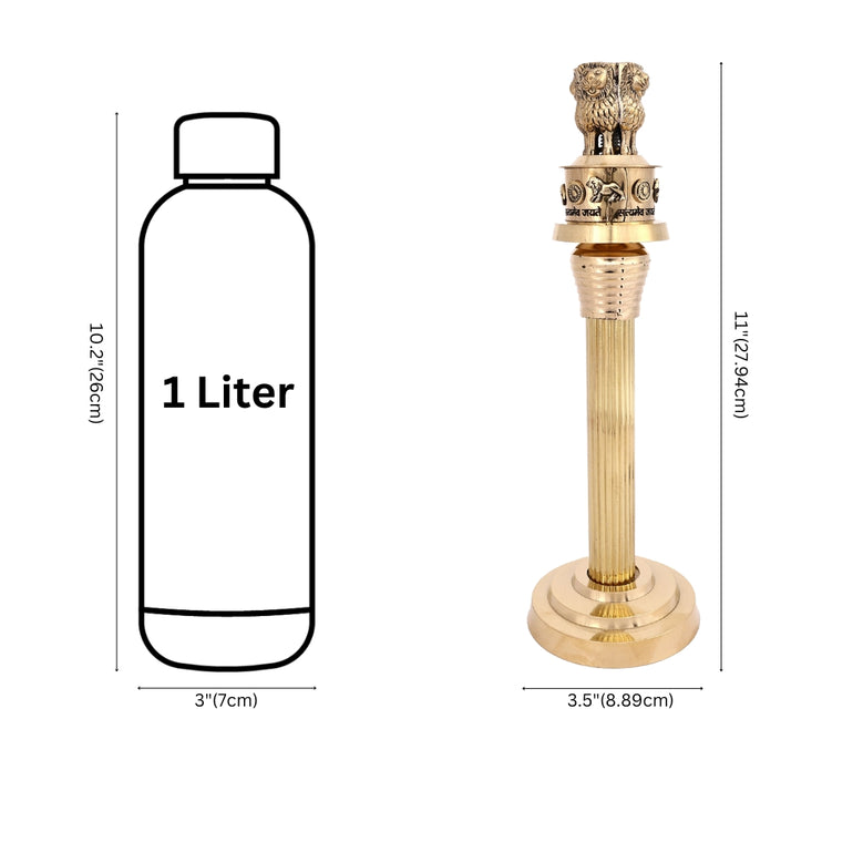 Celebrate India's rich history with this Handcrafted Brass Ashoka Pillar Replica, a stunning tribute to the nation's emblem of sovereignty and strength. Standing 11 inches tall and 3.5 inches wide, this meticulously crafted piece showcases intricate lion capital details with Sanskrit inscriptions, symbolizing power, integrity, and unity. Made from high-quality brass, it exudes a regal golden sheen, making it a perfect addition to office desks, study rooms, government institutions, or as a collectible for history enthusiasts. Whether as a decorative showpiece, a patriotic gift, or a motivational symbol, this Ashoka Pillar replica embodies India's timeless cultural legacy.