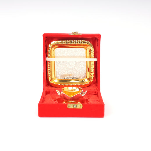 Sacred Light for Every Celebration! Let the warmth of this brass diya and tray set fill your space with serenity. Adorned with intricate traditional floral motifs, its perfect for bringing elegance to every spiritual, festive, and auspicious occasion. A thoughtful gift that will illuminate any sacred moment with grace and beauty., Material - Brass