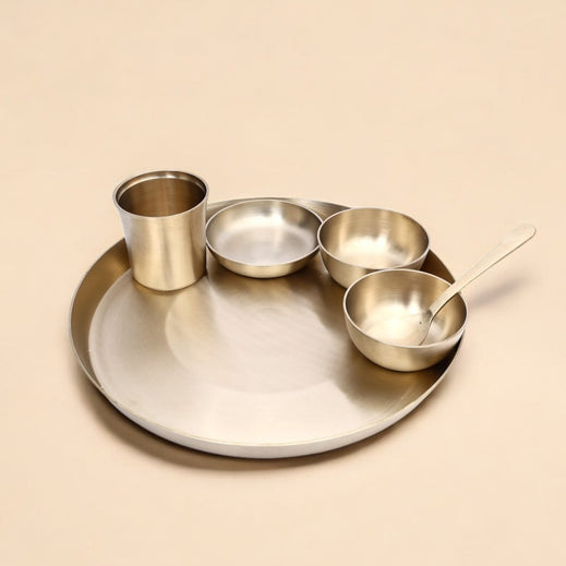 Handcrafted Pure Kansa 6-Piece Round Thali Set (1 round thali, 1 glass, 1 spoon, 2 round bowls and 1 flat bowl)