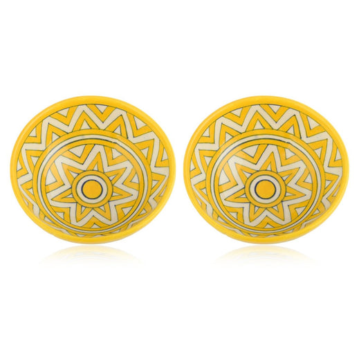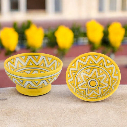 Elevate your gatherings with this exclusively handcrafted yellow bowl set, a beautiful reflection of the rich Blue Pottery art. Delicately hand-painted with intricate geometric patterns, these bowls are a testament to the renowned craftsmanship of the Rajasthan. They are designed to enhance your dcor and can also be used for tasty munching. This set can be bought as a gift, a piece of tradition and beauty from Rajasthan.Material - Blue Pottery - A blend of quartz powder, ground glass, saji, katira gond, and multani mitti.