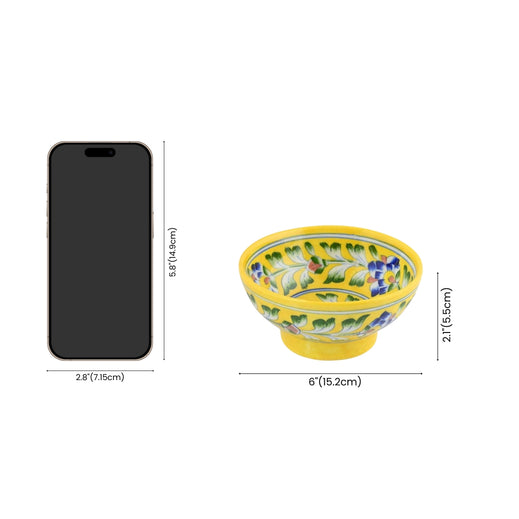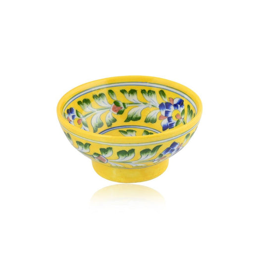 Embrace the charm of Rajasthan with this handcrafted yellow bowl set. The vibrant colours and delicately hand-painted floral motifs show the dedication and determination of skilled artisans who brought this art of Blue Pottery to life. Think of gifting this art to your loved ones or using it for your own to serve snacks or as a versatile dcor piece.Material - Blue Pottery - A blend of quartz powder, ground glass, saji, katira gond, and multani mitti.
