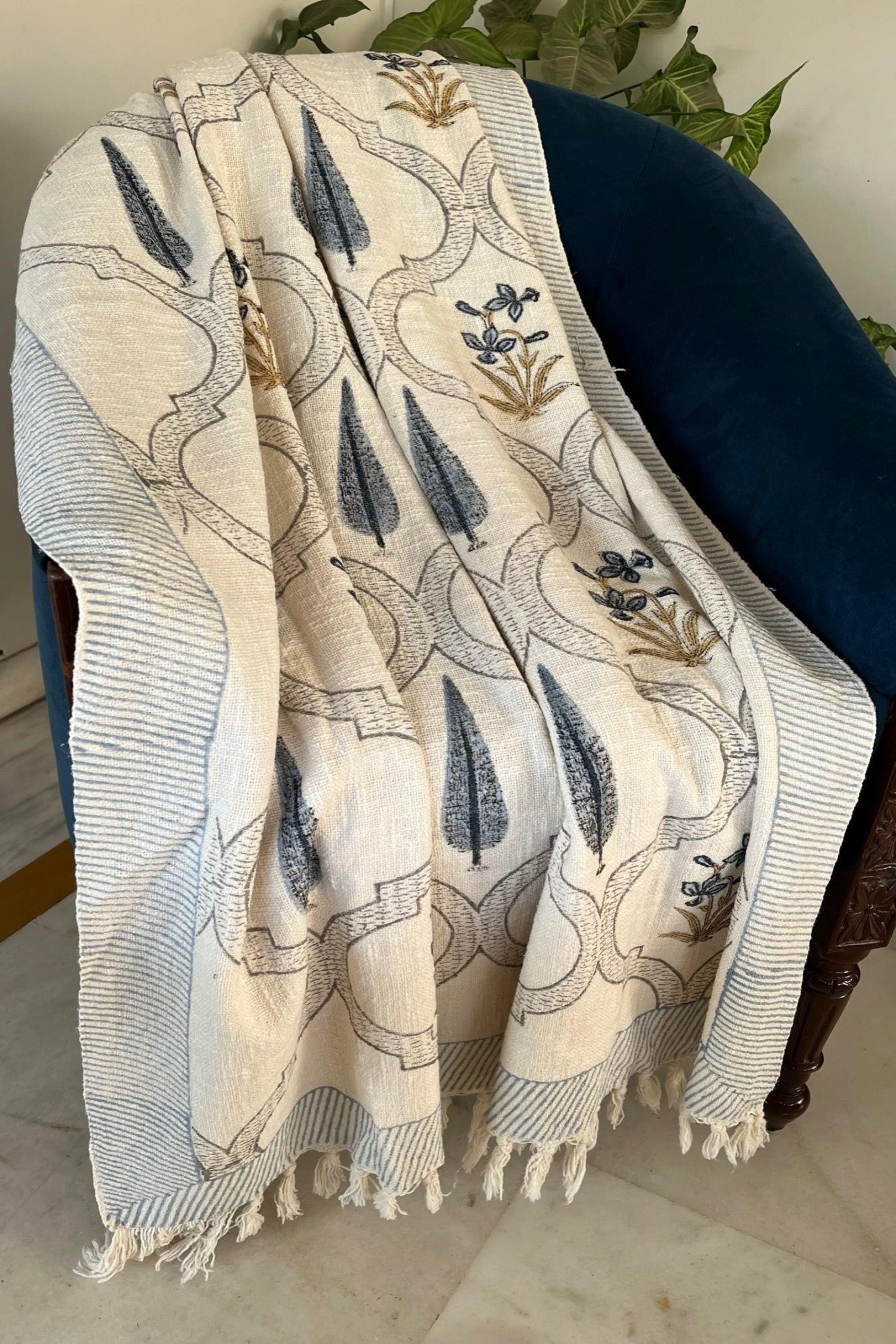 Step into a world of tradition and artistry with our Handloom Hand Block Throws. Each throw is a story woven to life, meticulously crafted by skilled artisans on traditional looms and adorned with captivating hand-block printed designs. Made from the finest natural fibers like cotton or wool, these throws offer exceptional breathability and just the right amount of warmth, making them perfect for year-round use.Embrace the Narrative:Handloom Heritage:Feel the texture of a bygone era. Each throw carries the legacy of handloom weaving, a tradition passed down through generations.Hand-Blocked Tales:Explore a tapestry of stories told through vibrant colors and intricate designs. Each motif whispers a tale of Indian culture and artistry.Natural Comfort:Bask in the breathability and softness of natural fibers. Whether you're seeking a cozy layer for chilly nights or a lightweight throw for cooler evenings, these throws ensure year-round comfort.Versatility Woven In:Drape it over your couch for a touch of warmth, use it as a picnic blanket for outdoor adventures, or add a stylish touch to your bed.The Gift of Tradition:Share the warmth of Indian craftsmanship with a thoughtful and unique present that embodies a rich cultural heritage.Product details: 100% cotton Size HandBlock printed. This versatile throw will provide luxurious comfort without compromising on style, making it the perfect addition to any space.Product care: Dry clean or gentle hand wash with cold water Colour may vary a little bit due to lighting Must read Imperfections are good If u see any slight imperfection then its a good news as it authenticates that the product is hand made Plus, they can be spot cleaned easily and require minimal effort for maintenance. This ensures that your handloom throw is able to maintain its luxurious appeal for a longer period of time.