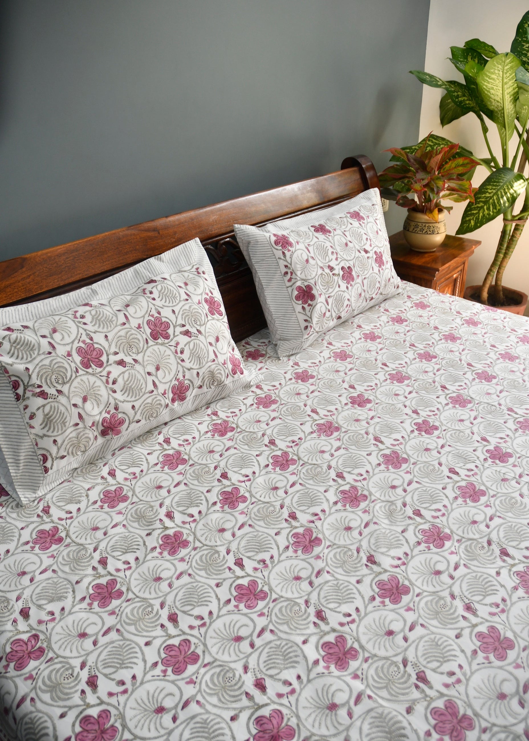 Description:Escape to a tropical paradise every night with the Hibiscus Bloom Bedsheet! This luxurious bedsheet boasts a stunning hand-blocked hibiscus flower design, meticulously crafted by artisans in Jaipur, India.Unparalleled Comfort:Made from premium, breathable cotton, this bedsheet offers unparalleled softness and comfort for a restful sleep.Vivid Bloom Design:The vibrant hibiscus flower pattern adds a touch of elegance and tropical flair to any bedroom decor.Hand-Blocked Charm:Each intricate detail of the hibiscus flower is hand-blocked, making your bedsheet a unique and artistic statement piece.Lasting Freshness:The breathable cotton ensures lasting freshness, keeping you cool and comfortable throughout the night.