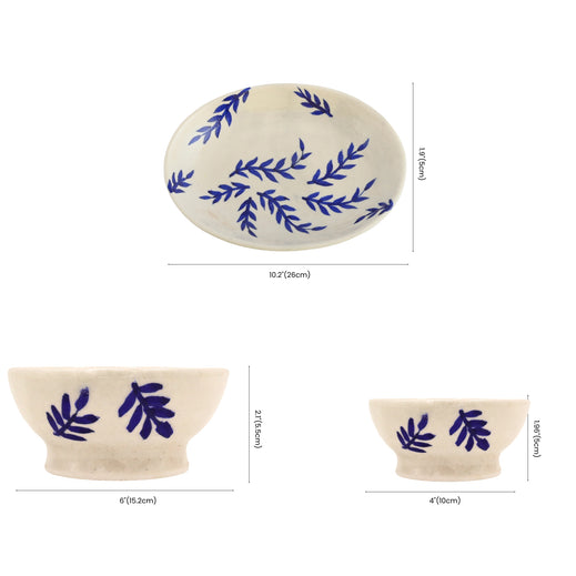 Elegant yet practical, this upgraded Indigo Leaf Pattern Serving Set captures the heart of Jaipurs Blue Pottery tradition with added depth for modern needs. Handcrafted and hand-painted with vivid blue leaf motifs, this set is designed to serve with both beauty and capacityideal for generous helpings of dips, desserts, or dry snacks.Material - Blue Pottery - A blend of quartz powder, ground glass, saji, katira gond, and multani mitti.
