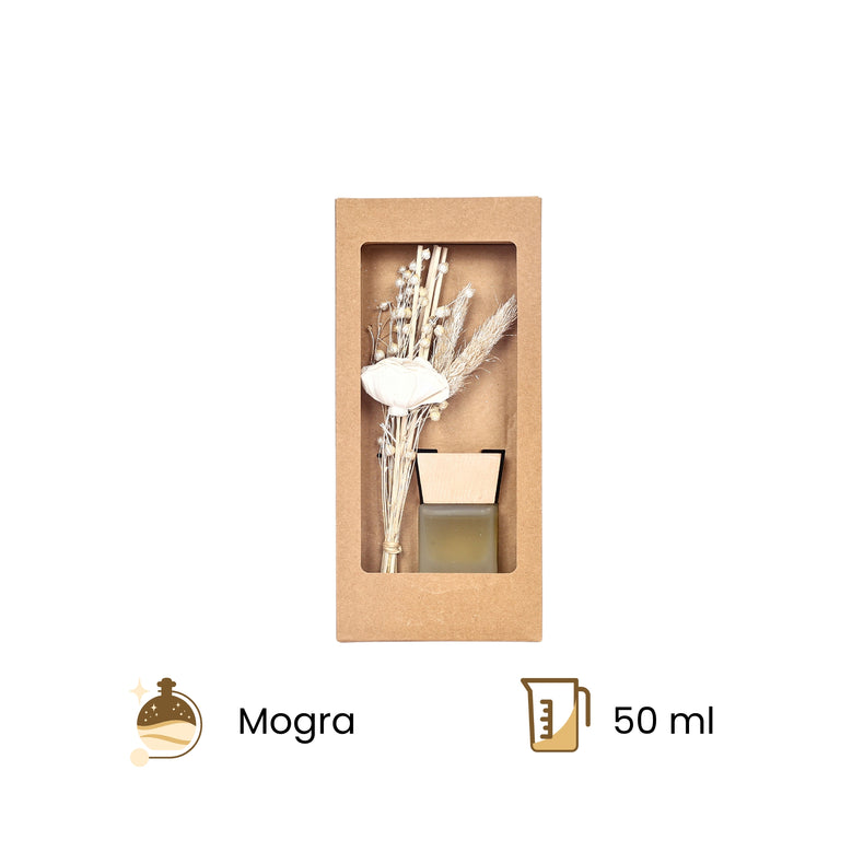Surround yourself with scents inspired by nature. Uplift your senses with our Jasmine Reed Diffuser and let the delicate, floral fragrance of jasmine transform your space. The soft white tones of handmade Sholapith flowers and naturally dried botanicals, enhanced with organic spray paint, bring elegance and serenity to any room. Perfect for creating a calm and inviting ambience, this diffuser adds a touch of natural beauty and grace to your home.Naturally dried grass, and handmade Sholapith flower