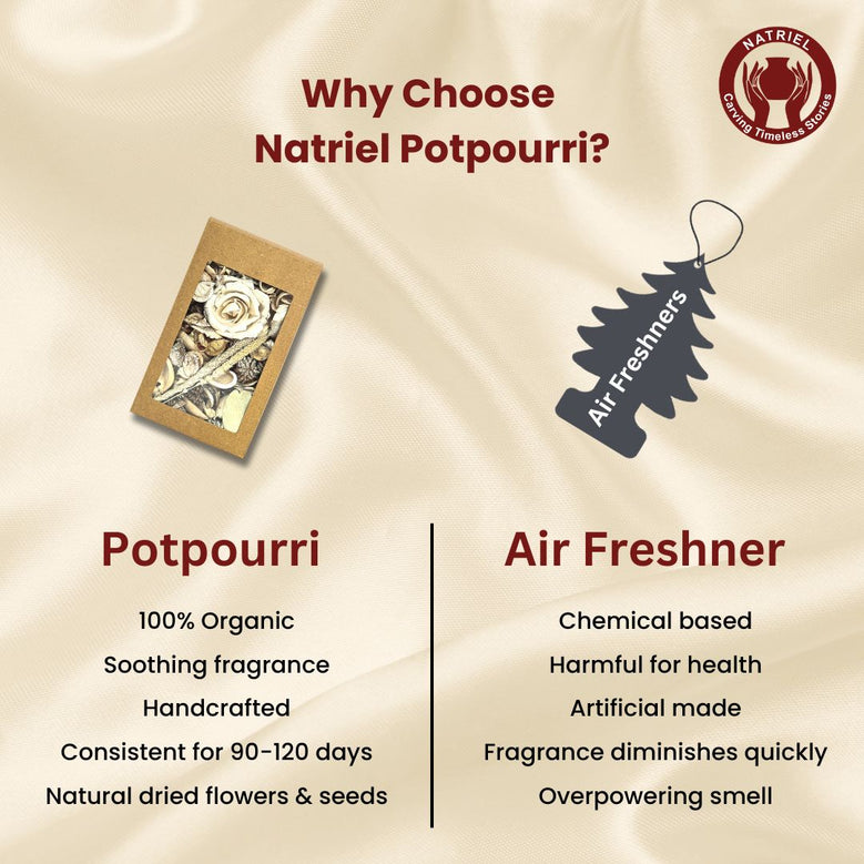 Dried blossoms and lush green leaves form the base of this elegant potpourri, delicately scented with jasmine essential oil. Each element is carefully chosen to retain its natural beauty. Perfect for creating a romantic ambience, its a decorative piece that fills your home with the allure of fragrant nights.Naturally dried flowers, seeds, and leaves